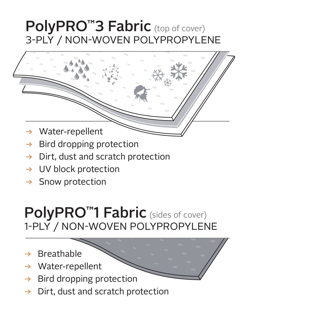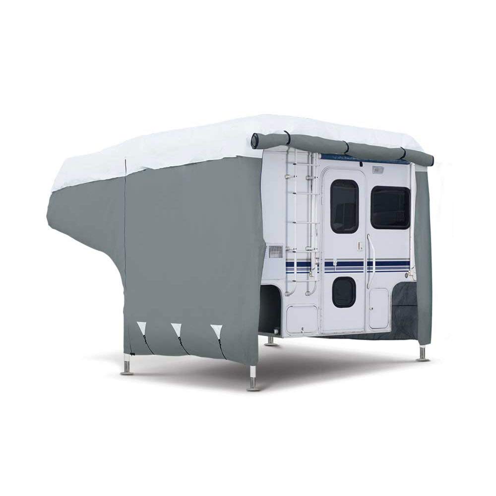 Q: What materials are used in the construction of this RV cover?A: This RV cover is made from durable PolyPRO3™ fabric, which offers excellent protection against rain, snow, dirt, and scratches, ensuring all-season durability and performance.