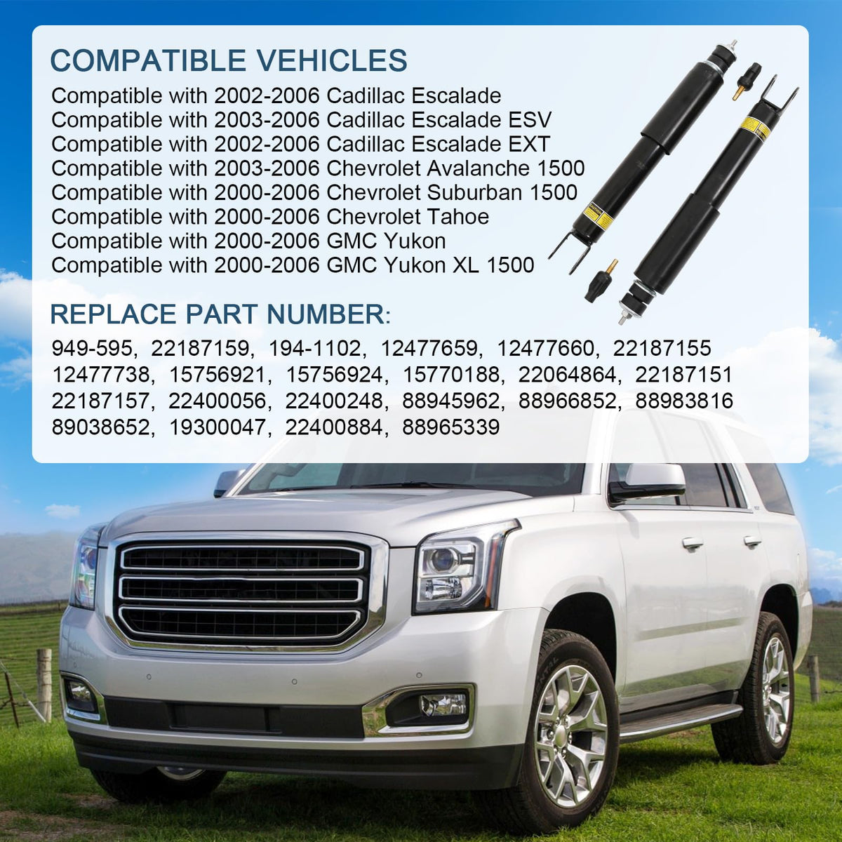 Replace Part Number: 949-595, 22187159, 194-1102, 12477659, 12477660, 2218715512477738, 15756921, 15756924, 15770188, 22064864, 2218715122187157, 22400056, 22400248, 88945962, 88966852, 8898381689038652, 19300047, 22400884, 88965339Compatible with Cadillac: Compatible with 2002-2006 Cadillac EscaladeCompatible with 2003-2006 Cadillac Escalade ESVCompatible with 2002-2006 Cadillac Escalade EXTCompatible with Chevrolet: Compatible with 2003-2006 Chevrolet Avalanche 1500Compatible with 2000-2006 Chevrolet Suburban 1500Compatible with 2000-2006 Chevrolet TahoeCompatible with GMC: Compatible with 2000-2006 GMC YukonCompatible with 2000-2006 GMC Yukon XL 1500Package Include: 2x Front Air Strut Shock Absorber