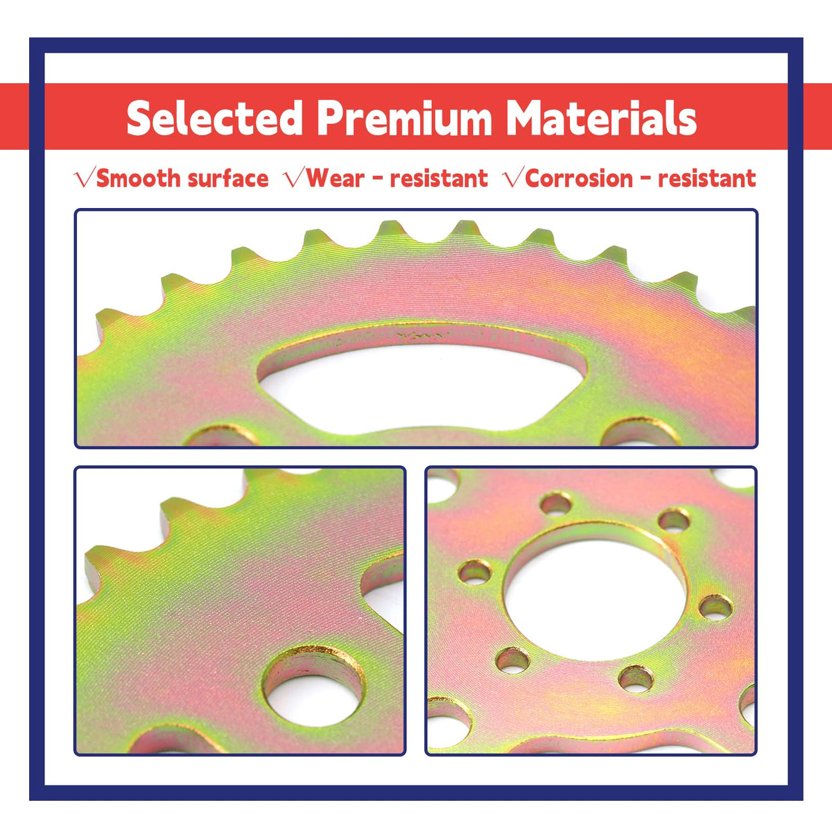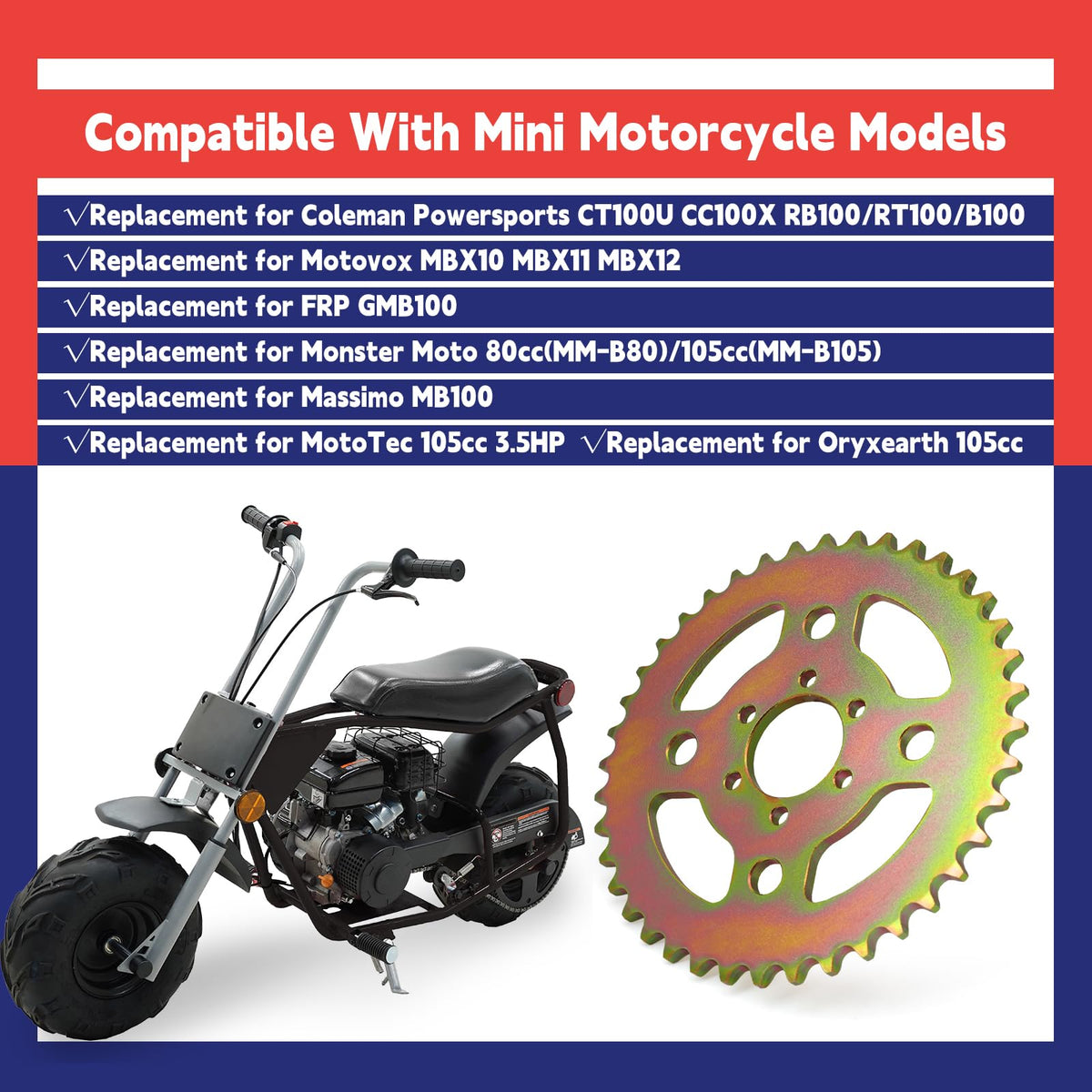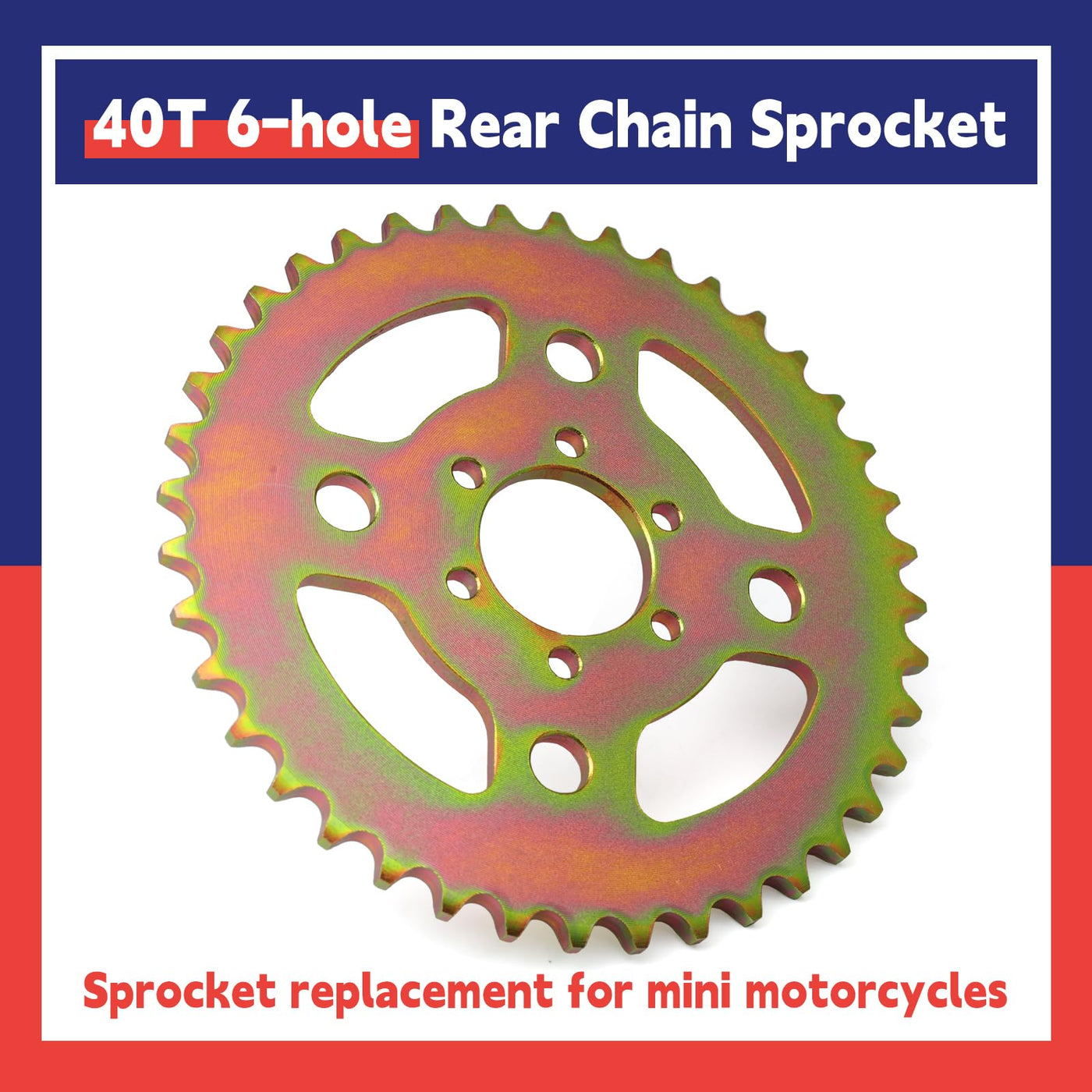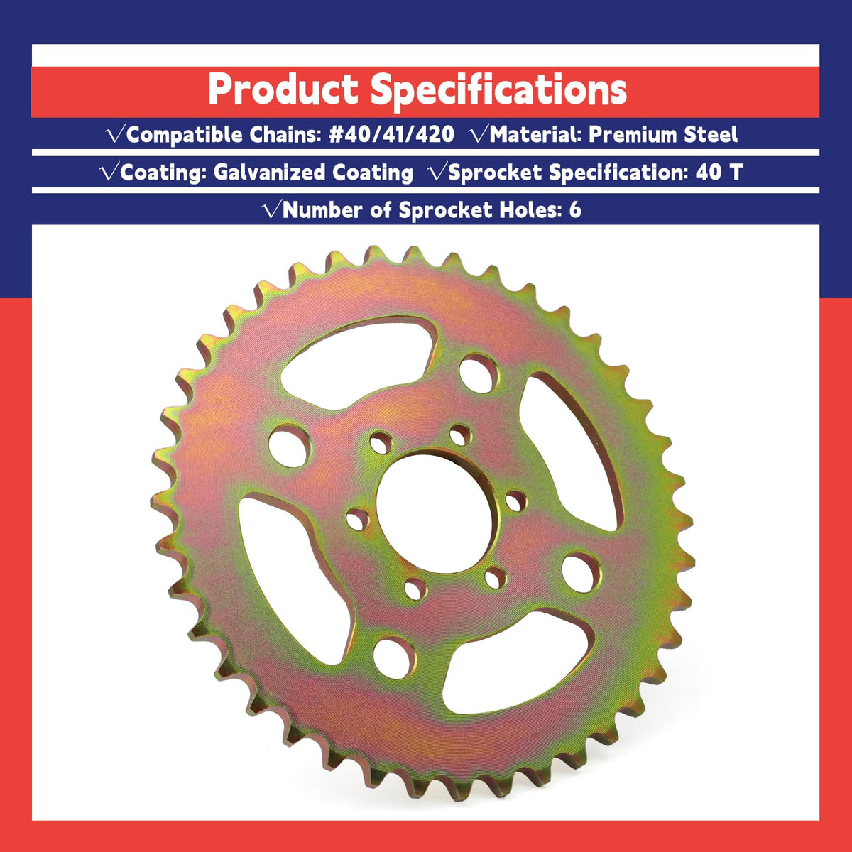 Replacement 40T Fast Speed 6 - Hole Rear Chain Sprocket for #40/41/420 Mini Bikes Mini Bike Compatible Models: Replacement for Coleman Powersports CT100U Replacement for Coleman Powersports CC100X Replacement for Coleman Powersports RB100 Replacement for Coleman Powersports RT100 Replacement for Coleman Powersports B100 Replacement for Motovox MBX10 Replacement for Motovox MBX11 Replacement for Motovox MBX12 Replacement for FRP GMB100 Replacement for Monster Moto 80cc(MM-B80) Replacement for Monster Moto 105cc(MM-B105) Replacement for Massimo MB100 Replacement for MotoTec 105cc 3.5HP Replacement for Oryxearth 105cc Product Introduction: Compatible Chain: #40/41/420 Material: Premium steel Number of Sprocket Holes: 6 holes Sprocket Specification: 40 teeth Coating: Galvanized coating