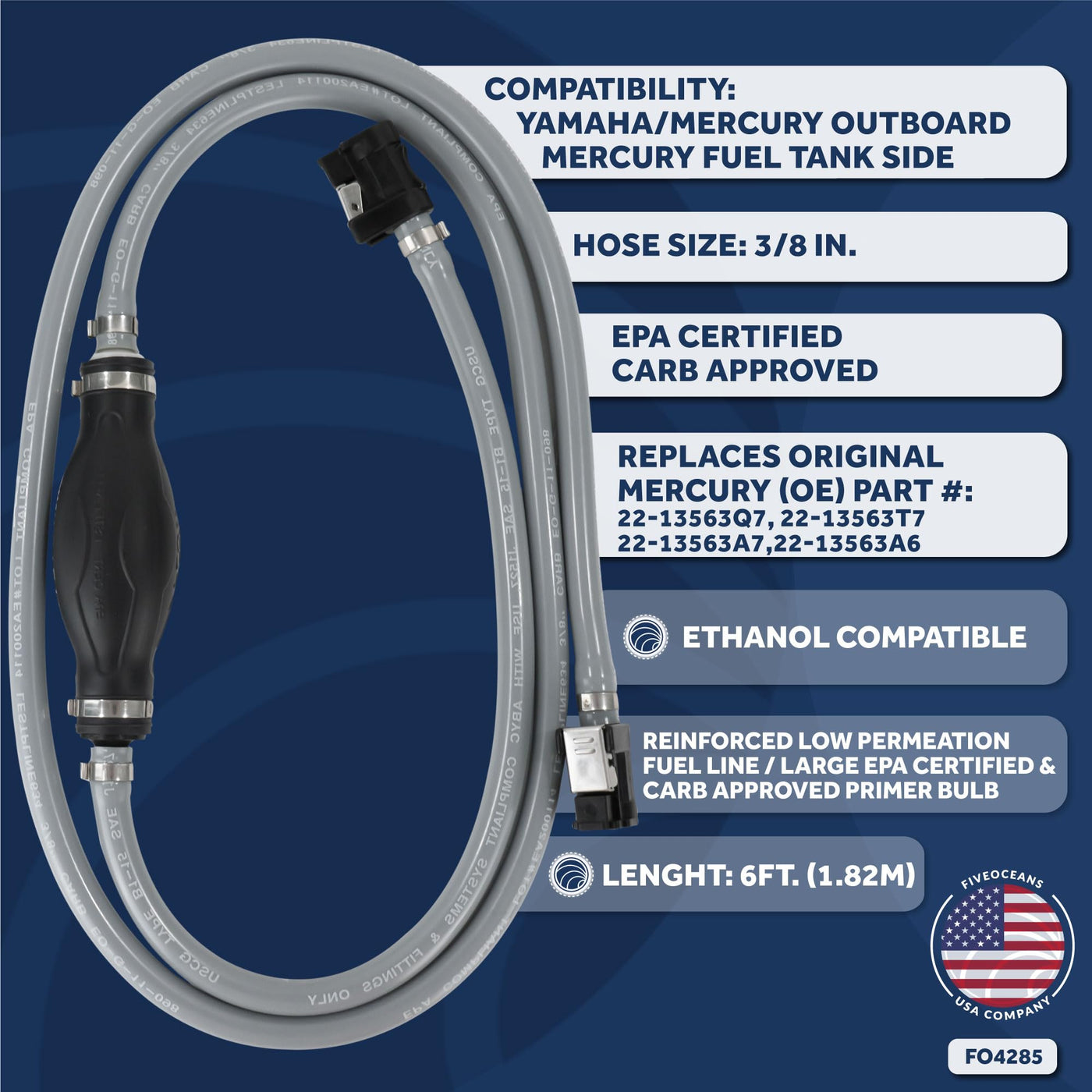 COMPATIBILITY: All Yamaha/Mercury Engines and Mercury Fuel Tank Side - Replaces Original Mercury (OE) Part #: 22-13563Q7, 22-13563A7, 22-13563A6, 22-13563T7.PACKAGE INCLUDES: A Leakproof 3/8-Inch Fuel Line Assembly Hose 6-Foot Length, a Premium Primer Bulb, 2 Yamaha/Mercury Female Quick Connectors and 2 Stainless Steel Hose Clamps.MULTI-LAYER: Low-permeation Primer Bulb 3/8 Inch Hose that provides reliable and efficient priming to help start your boat engine.FUEL COMPATIBILITY: Primarily used for fuel feed. Compatible with gasoline up to 85% ethanol-blended fuels, diesel, and all bio-diesel blends.DURABLE MATERIAL: Engineered and designed with marine-grade material. This Fuel line is weather and UV Resistant. Meets USCG type B1-15 SAE J1527 and ABYC Accepted Standards. Reinforce Hose Approved by Environmental Protection Agency EPA and CARB regulations.