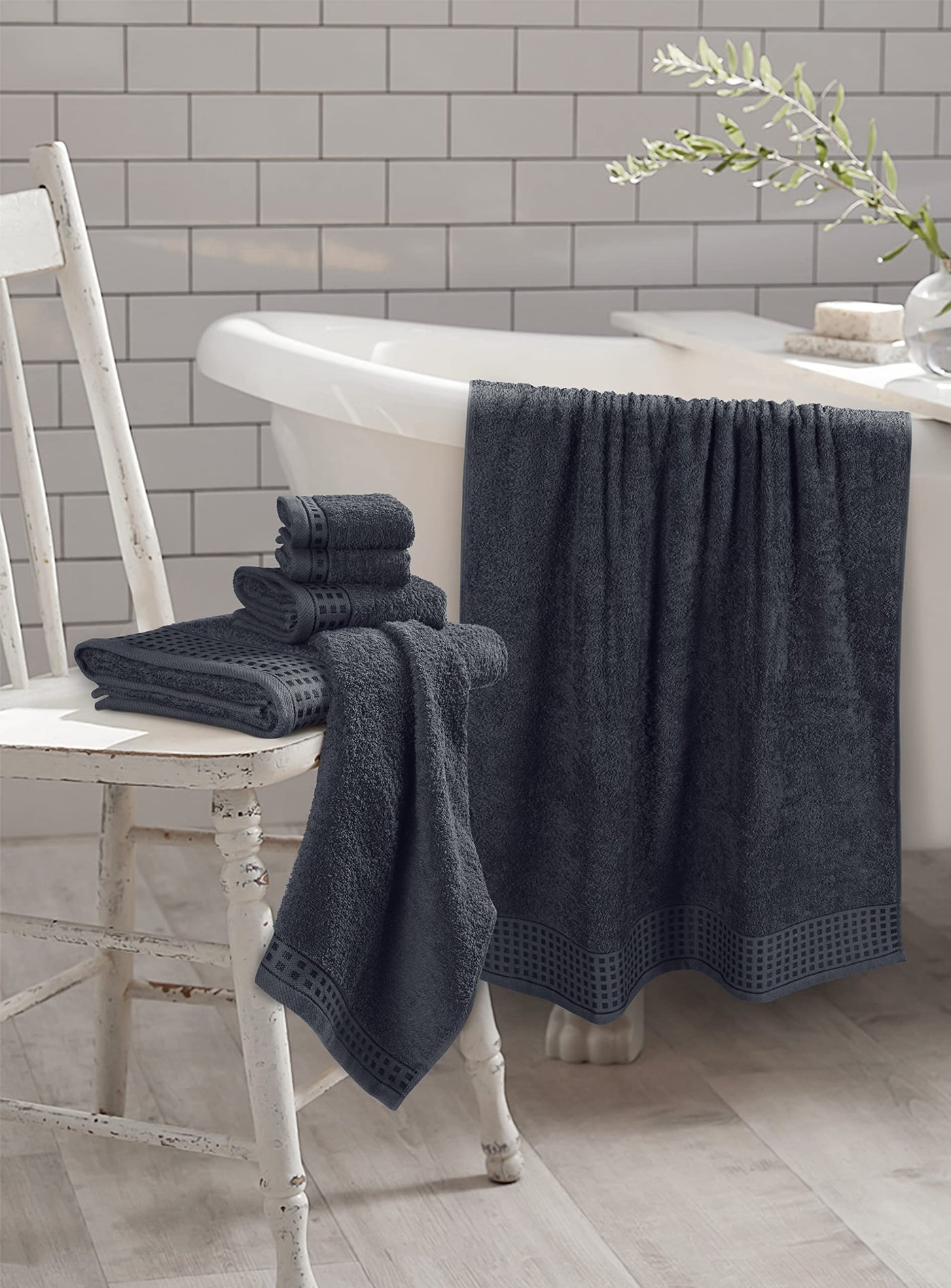 Q: What are the dimensions of the towels included in the set?A: The GLAMBURG towel set includes two oversized bath towels measuring 28x55 inches, two hand towels measuring 16x24 inches, and two washcloths measuring 12x12 inches.