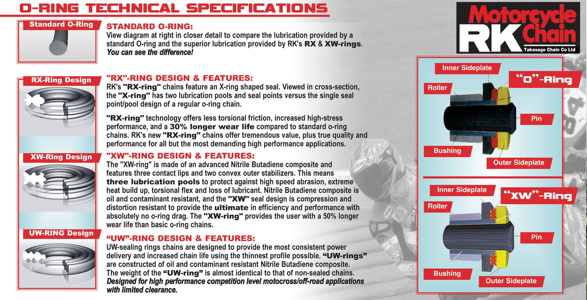 RKs traditional round O-ring chain is a convenient blend of performance and affordability. SOs O-ring is constructed from Nitrite Butadiene to seal in lubrication and deliver smooth power with minimal seal ring drag or loss of horsepower. 520SO chains are suitable for low to mid-range CC motorcycles that came from the factory with sealed chains. 520SO can be used for both on street and off-road up to 400ccs. Tensile Strength: 6,900 lbs; Max CC Rating: 400cc Street, 400cc Off-road/ATV; Max Horsepower: 60 HP; Weight per 100 Links: 3.39 lbs; Max Chain Width: 21.7mm; Master Link Included: Clip type.