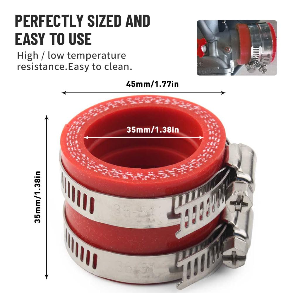 Fitment: - It can be used for 100-200cc ATV / Scooter / Dirt Bike / Go Kart, etc. - Fit for MIKUNI For KEIHIN For ZSDTRP OKO KOSO PWK 21mm 24mm 26mm 28mm 30mm, PE 28mm 30mm Carburetor. Package Included: - 1 PC (35 mm) Specifications: - Brand new and high quality. - Technology: Injection Molding - Color: Red - Material: High quality rubber and aluminum alloy - Size: Inner diameter 35 mm Features: - This Carburetor Rubber Adapter Intake Manifold is perfect fit for your motorcycle carburetor. - Made of premium rubber material and adopt injection molding technology, oil resistant and durable in use. - Good working condition, easy to install and replace. - High / low temperature resistance. - Easy to clean. - Environmentally friendly.