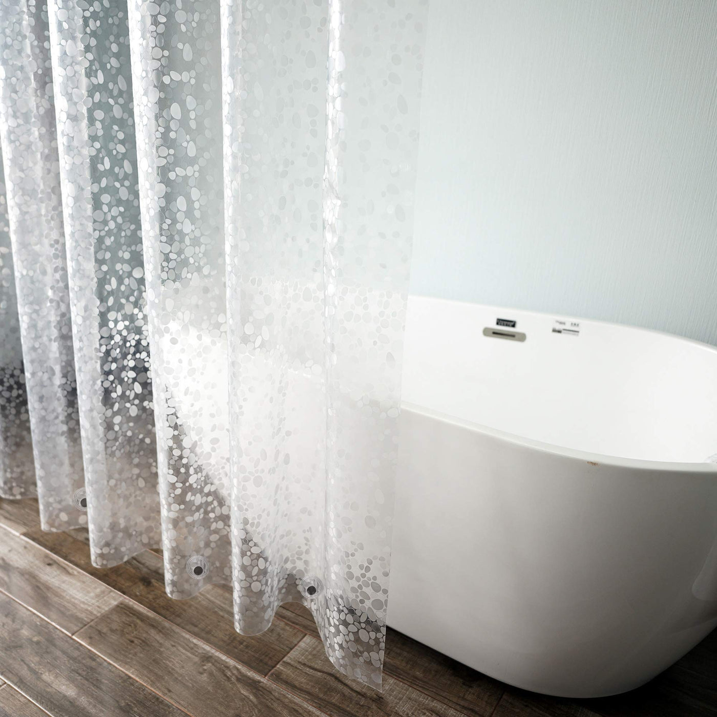 Basic Information: Pattern theme: Cobblestone pattern Material: EVA Functions: Water repellent Weight features: Heavy duty Product size: 54x72 inch Color: Semi-transparent Care instructions: Wipe clean with a damp cloth. We recommend opening shower curtain to dry after each use. Package: Shower curtain with 9 hooks