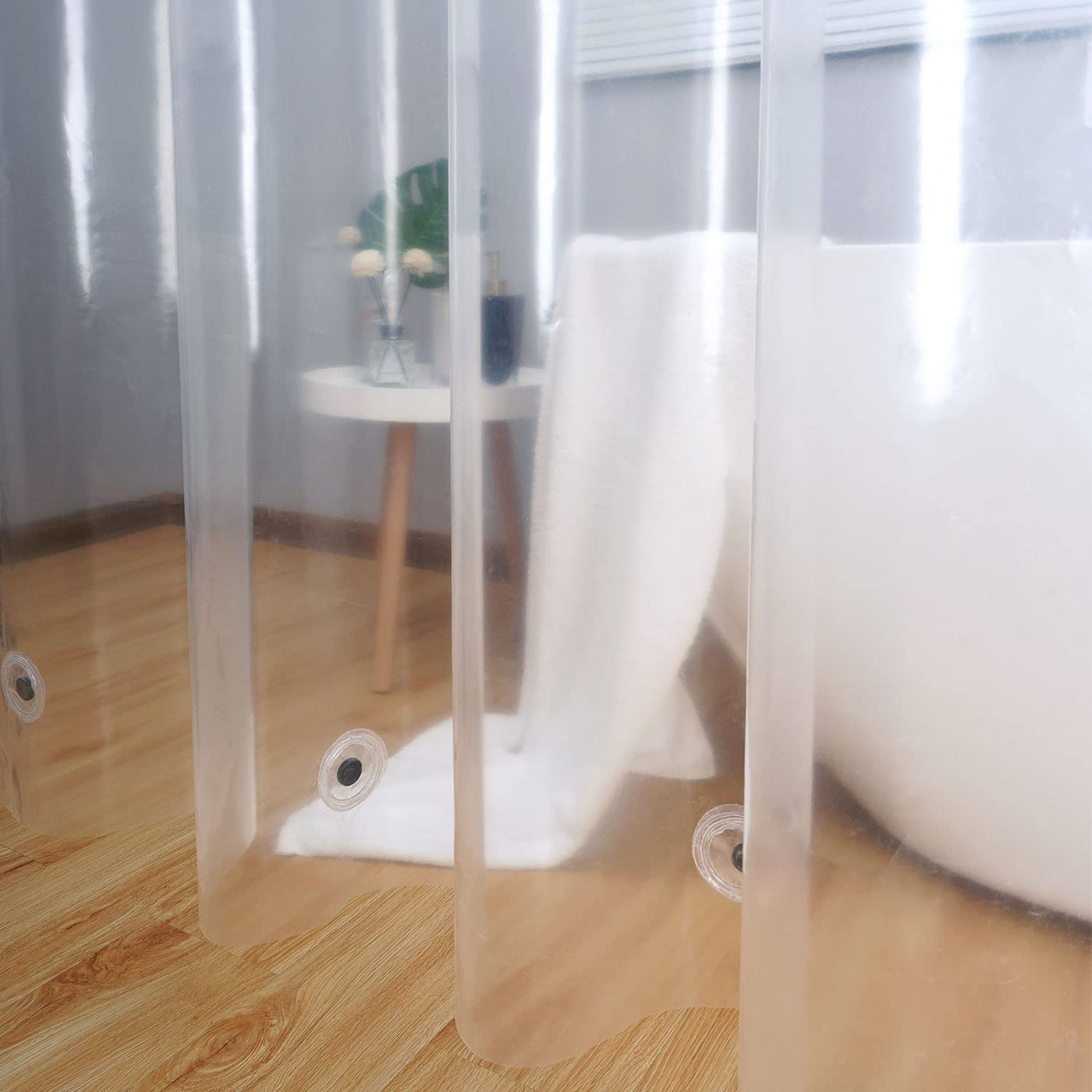Q: How do the bottom magnets work on this shower curtain liner?A: The heavy-duty bottom magnets help to keep the shower curtain liner securely in place, preventing it from sticking to your legs while you shower.
