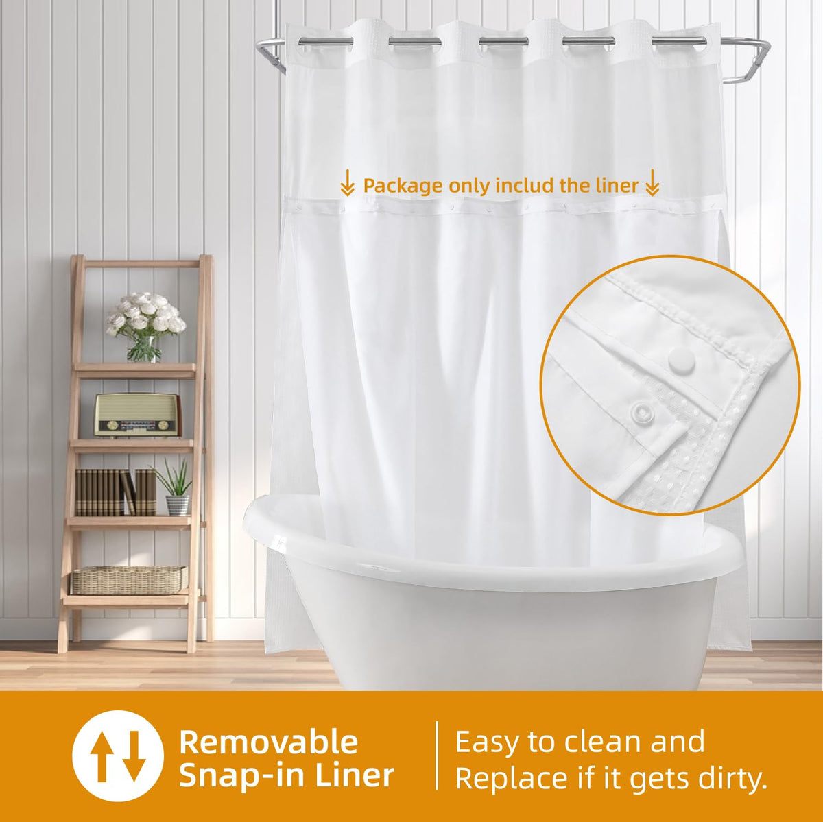 ? Package contains: EACHOPE Fabric Shower Curtain Liner with Snap;Shower curtain and hooks not included