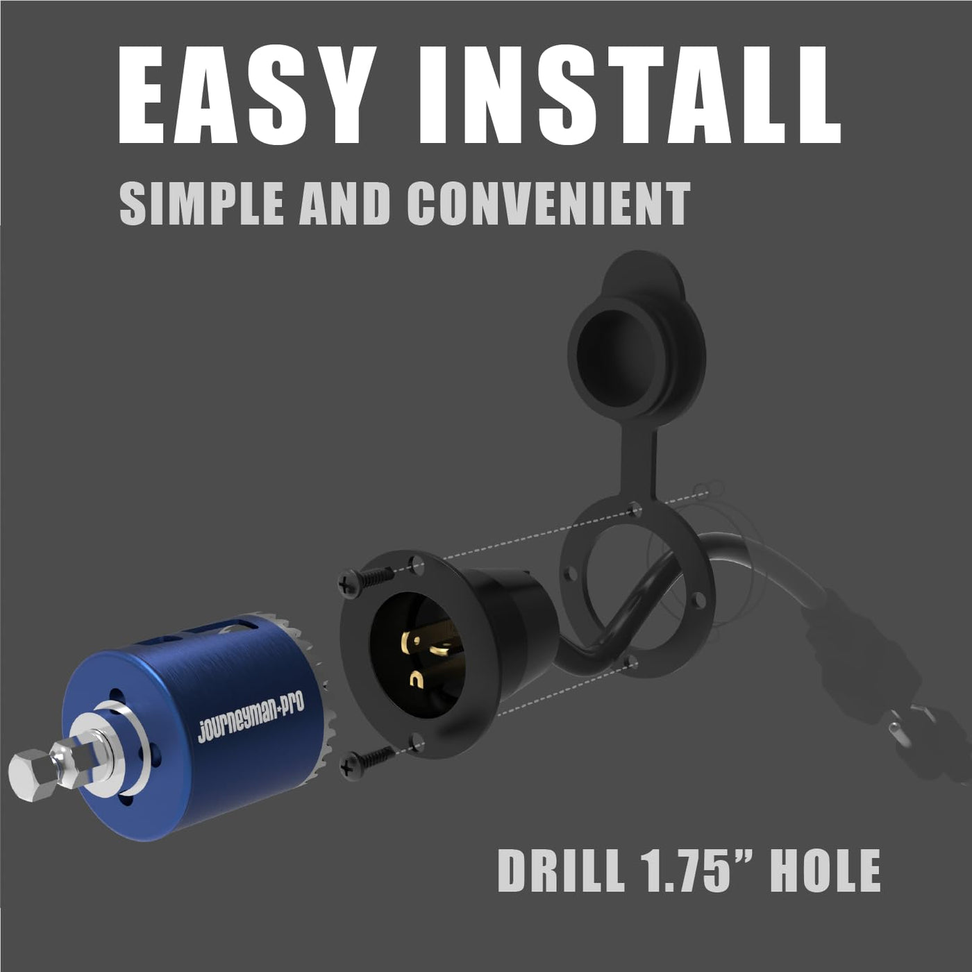 Q: How do I install the Journeyman-Pro power inlet socket?A: Installation is straightforward; it requires a simple flush mount into a 1.75-inch hole size. No modification or hand wiring is needed, making it easy to set up.