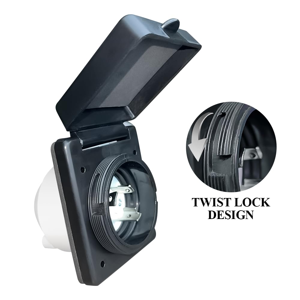 Q: How does the twist lock design work?A: The twist lock design features a threaded connection at the prong points, ensuring that the power cord securely attaches to the inlet, preventing accidental disconnections during use.