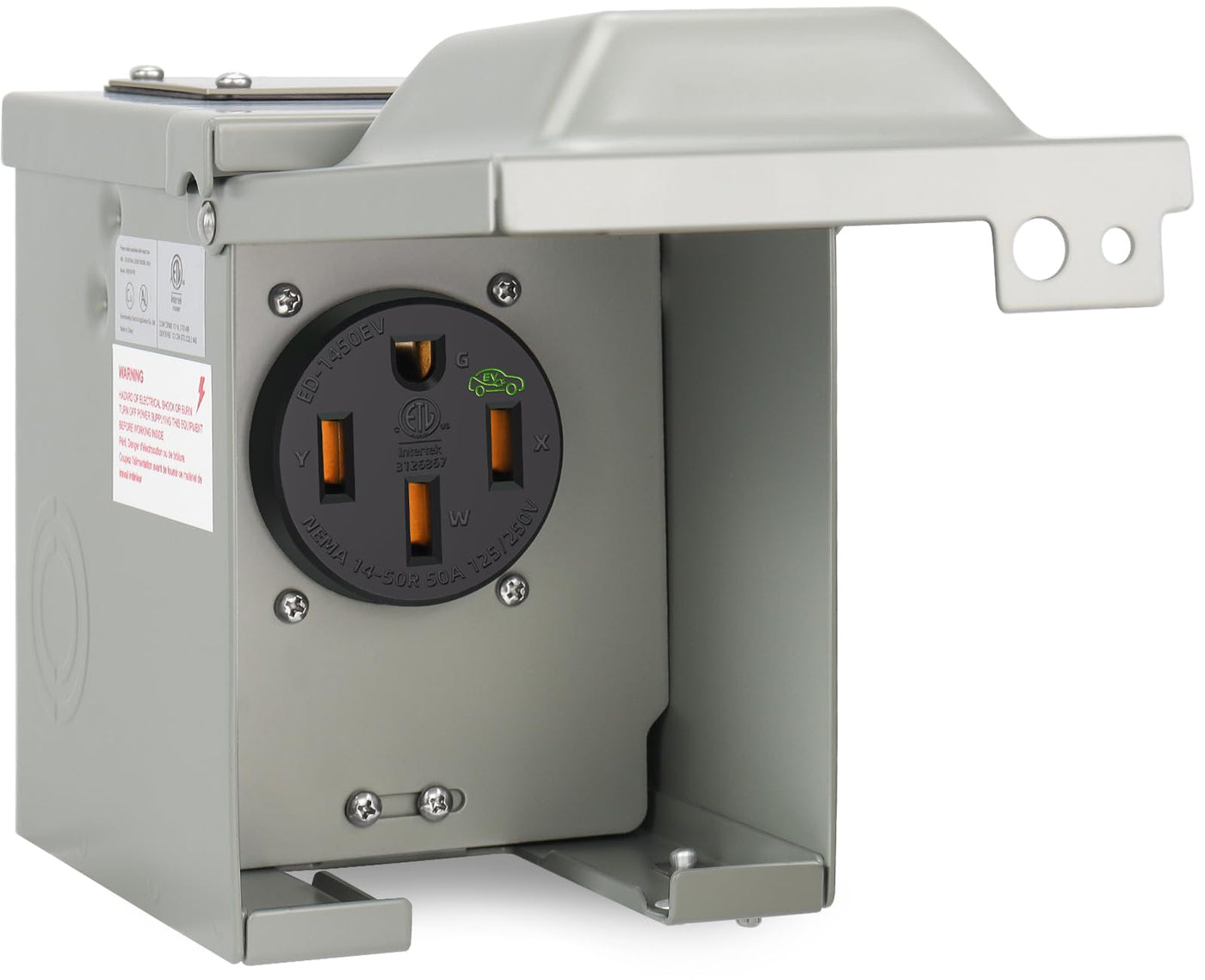 EXCELFU 50 Amp EV Charging Receptacle Outlet Box for Electric Vehicles, RVs, Large Appliance Solutions for your entire homes EV charging and high-load electrical applications powering EXCELFU provide 3 types of EV outlet for covering your homes need, a 50 amp receptacle with NEMA Type 3R enclosure and can be installed wherever you need. A flush receptacle with wall plate for mounted directly into the wall. A outlet can be used with 2 gang wall plate or outlet box Heavy-Duty EV Charging Receptacle EV power outlet with brass terminal blades and copper contacts, durable materials, features excellent electrical conductivity and sustain high-frequency insertions by electric vehicle chargers Specification • Current Rating:50 Amps • Voltage Rating: 125 Volt/250 Volt • Socket type: Nema 14-50R receptacle • Certification: ETL listed