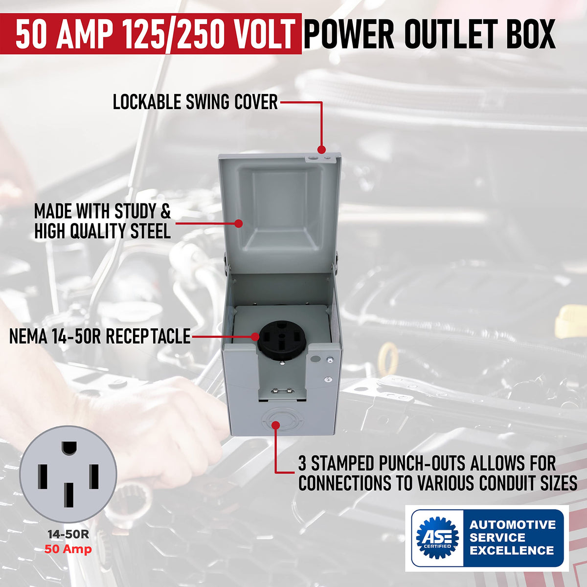 This Power Outlet Box Is Constructed To Provide Consistent Dependable Power To Rvs. A 50 Amperage Electrical Panel With An Outdoor Rated Nema 14-50R Receptacle And 125V/250V For Travel Trailer, Campers, Generator And Electric Car At Your Home, Parking Space, Garage, Yard Or Camping Ground. This Power Outlet Panel Has Enough Room For Wirings And Protection Of Plugging In The 50A Rv Cord. The Door Is Very Easy To Open And Close And Lockable To Avoid Unauthorized Use Even While It'S Plugged In.This Type 3R Rv Power Outdoor Outlet Box Is Made Of Sturdy And High Quality Iron Steel. The Enclosure Is Powder Coated Which Is Reliably Durable, It Prevents Rusts And Can Resist Corrosions. This Type 3R Power Outlet Box Withstands Exposure To Weather Without Any Damage And Has Resistance To Electric Shock For Safety.This Is A Complete Power Outlet Box Manufactured By Aa Ignition Which Comes With Electrical Wiring Spots. The Knockout Punch Holes On Top Which Are The Existing 4 Holes (Recommended), Bottom And Side Which Needs To Be Worked Out Manually By Adding And Piercing The Metal With Proper Tools, Preferably A Knockout Punch Set Or Drill To Connect Conduit. It Also Has Screw Holes And A Hook Hole At The Back Side Ready For Mounting Near The Vehicle'S Parking Space And The Breaker Panel. Save Time From Going To Different Places Like Truck Stops, Parking Lots Or Other Camping Grounds To Supply Or Recharge Power To Your Rv By Purchasing This 50Amp Power Outlet Panel From Aa Ignition. Great For: Rv Camper Travel Trailers Electric Car Motorhome Generator Tesla Universal Part