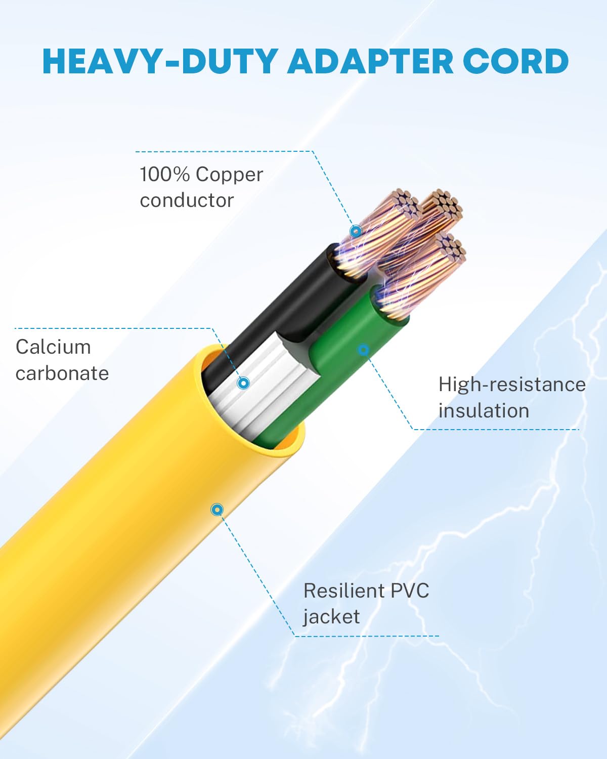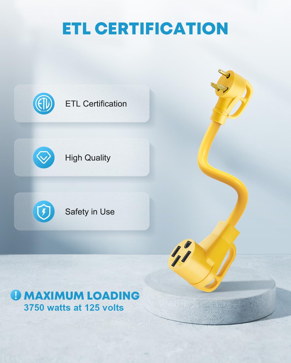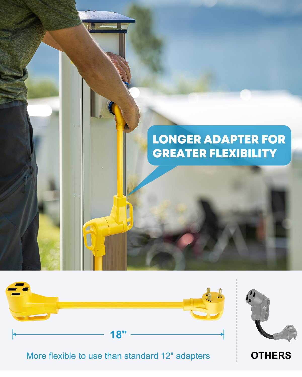 ?30M to 50F Adapter?30AMP (TT-30P) male to 50AMP (14-50R) female adapter for you to convert the power at a campground to fit for your 50A RV (NOT for EV or Tesla Model Y), an easy power conversion. | ?18'' RV Adapter?Longer RV dogbone 30A to 50A adapter is 18 inches, more flexible to use. And the power cord can be 180 degrees bent from the male end to the female end. | ?Grip Handle Design?Both ends of the 30 Amp to 50 Amp RV power adapter are designed with ergonomic Grip handles, making removal from a plug or outlet much easier, effectively saving physical strength. | ?Well Constructed?Kohree 30 Amp to 50 Amp RV Electrical adapter cord is 100% copper and coated with a heavy-duty flame retardant, heat resistant PVC sleeve well protects it from outdoor elements, wear and tear. | ?Wide Applicability?This rv adapter cord 30 amp male to 50 amp female perfect for camper vans, trailers, motorhomes, caravans, supplying power quickly for the refrigerator, air conditioner, microwave oven, roaster, kettle, lamp, and other household appliances.