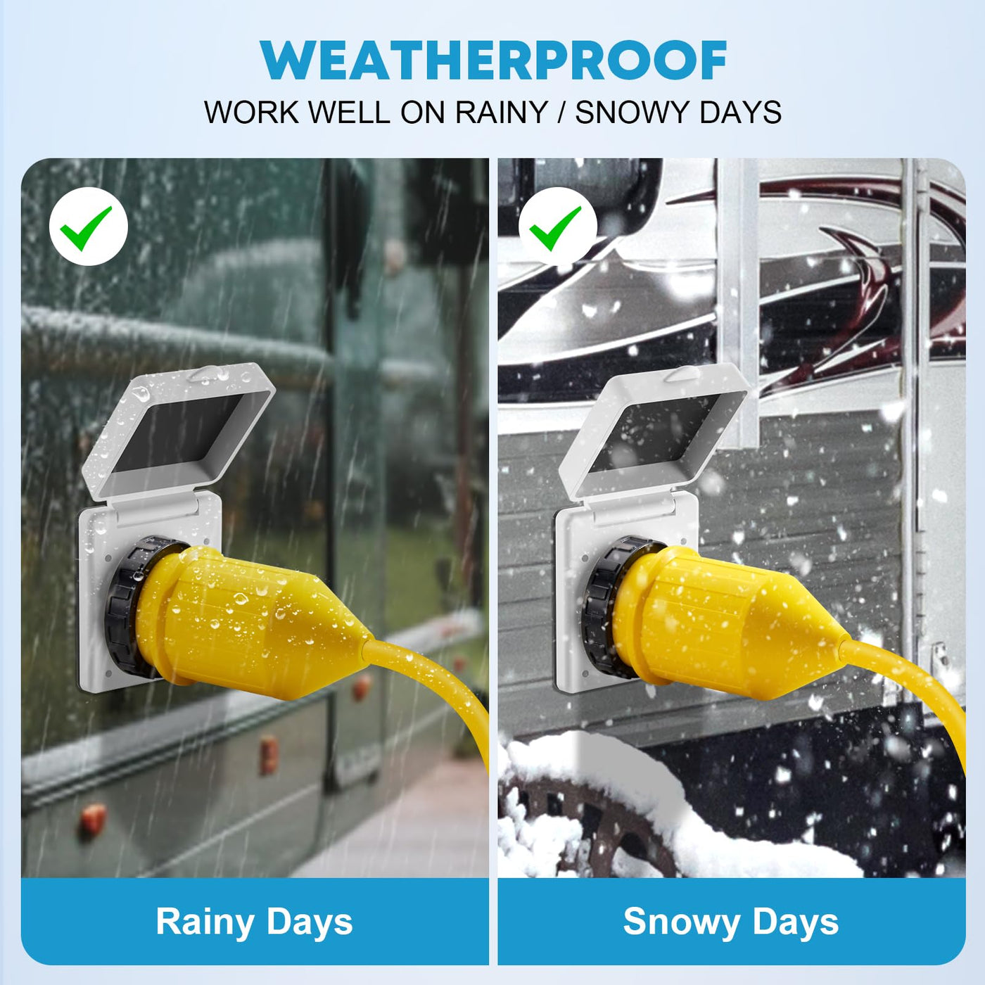Kohree 50AMP Twist Lock with Boot is widely used for RV, trailer, camper, marine watercraft and other outdoor applications. Specifications: Overall length: 6.5-inch (16.5cm) Cover and ring: 2.4-inch (6.1cm) inner diameter (ID), 3-inch (7.6cm) outer diameter (OD) Inside Depth: 3.5-inch (8.9cm) Outer Length: 5.25-inch (13.3cm) Connector: Approximately 2 inches (5.1cm) across face and 5 inches overall length Across the back where the cord enters adds 0.25 inch (2.25 inches / 5.7cm across) Steps to Install: 1. Remove the housing by loosening screws; 2. Slide the boot over cable; 3. Strip cord outer jacket and each individual conductor to expose the copper wire; 4. Insert all wires into proper colored coded terminal pockets.