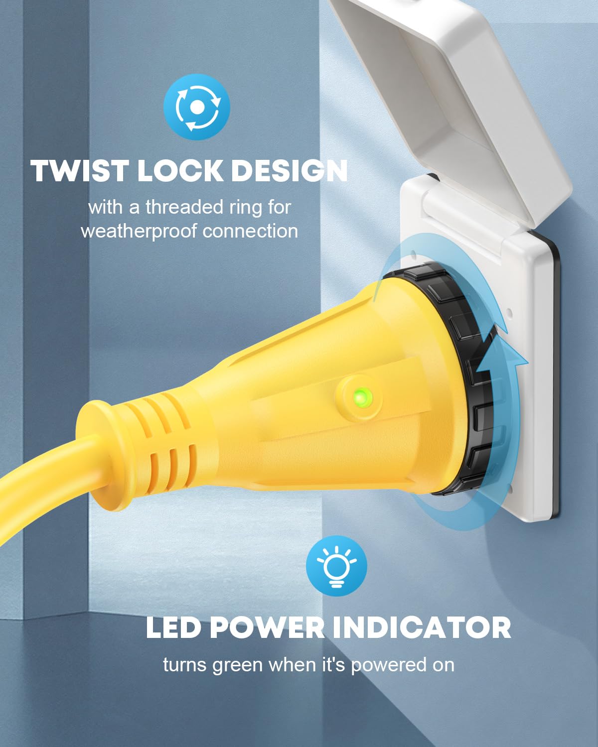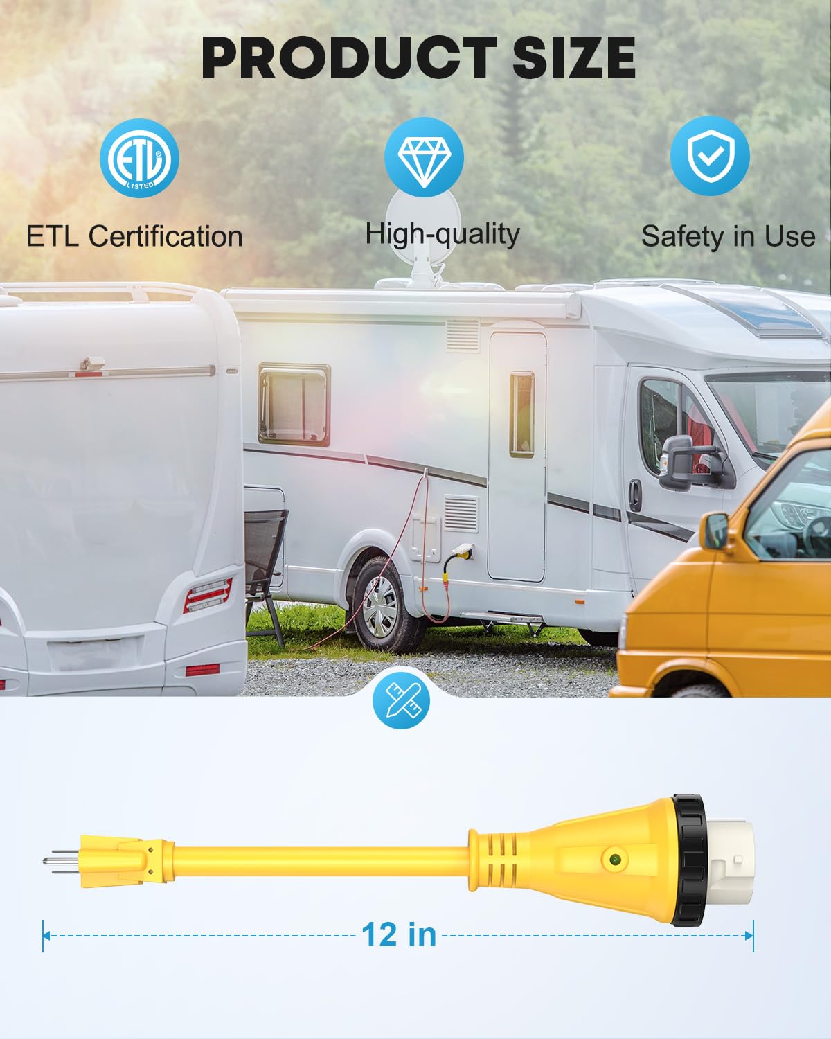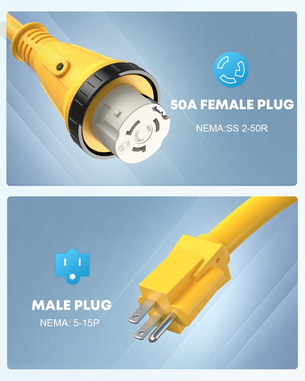 ?Application?: For your RV which is equipped with a 50 AMP twist lock adapter power inlet and needs to plug into a 15 AMP power source. | ?Electrical Rating?: MALE Plug 15Amp is NEMA 5-15P, 125V. FEMALE Receptacle plug 50Amp is NEMA SS 2-50R, 125/250V. | ?Twist Locking Receptacle?: 50A Female locking connector is a watertight molded plug with a threaded ring for a weatherproof connection. | ?LED Power Indicator?: 50 amp to 110 adapter RV plug designed with the LED power indicator will glow green when there is power. | ?Safety?: Molded RV dogbone electrical adapter cord made of heavy-duty polyvinyl plastic, 100% copper 10/3 gauge STW wire.