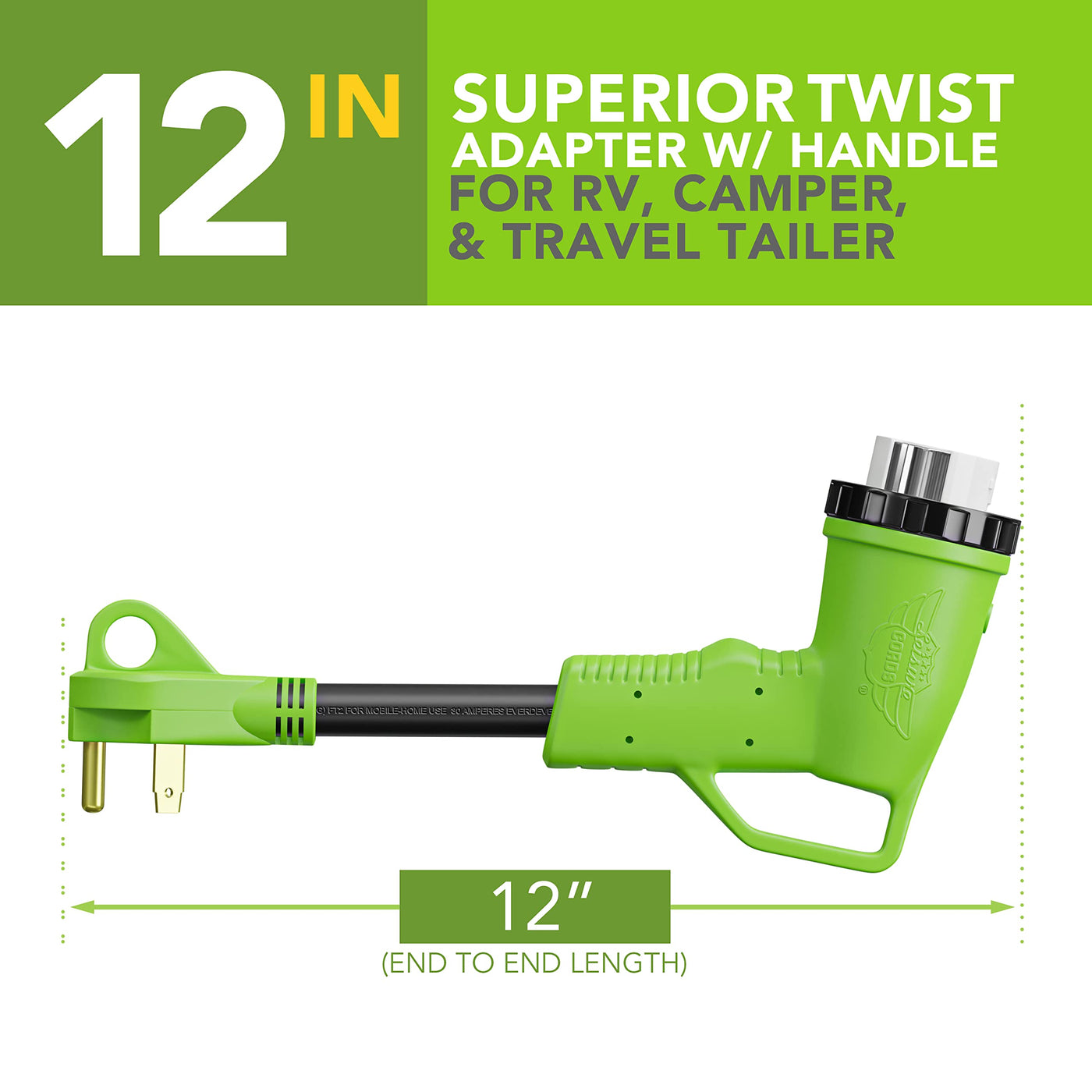 Remember your Leisure Cords 12" 90-Degree Dog-Bone Adapter, and forget your worries about power while traveling. Its the perfect tool to keep in your RV for your next trip. Use it to hook up your 50-Ampere to a 30-ampere power source. The 90-degree angle is specifically designed to reduce strain on the cord. Our RV adapter allows for an easier install in hard-to-get places. The female end has a sturdy handle and a LED power indicator light, and it is manufactured with a threaded twist receptor that creates a weatherproof connection that locks and keeps the adapter in place.