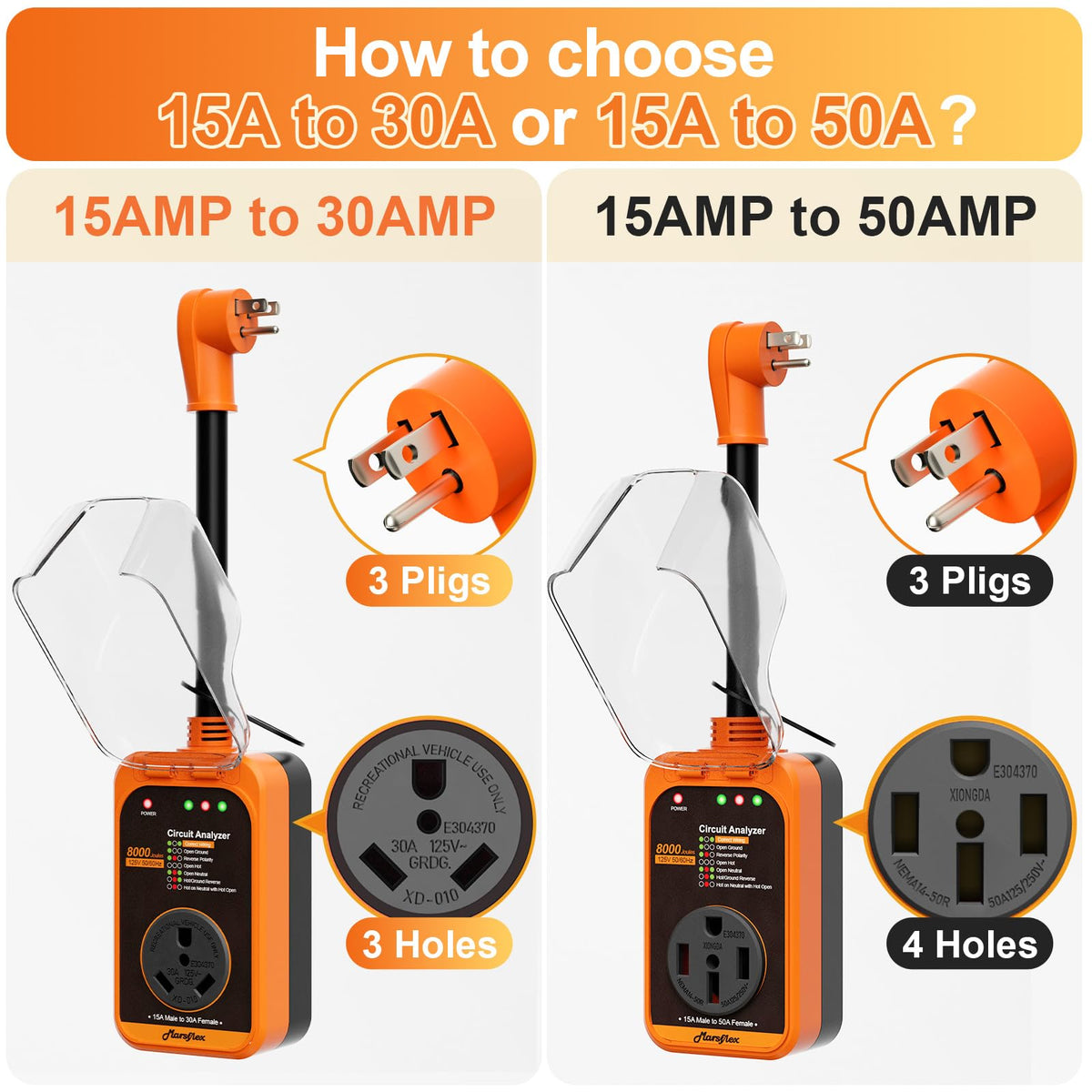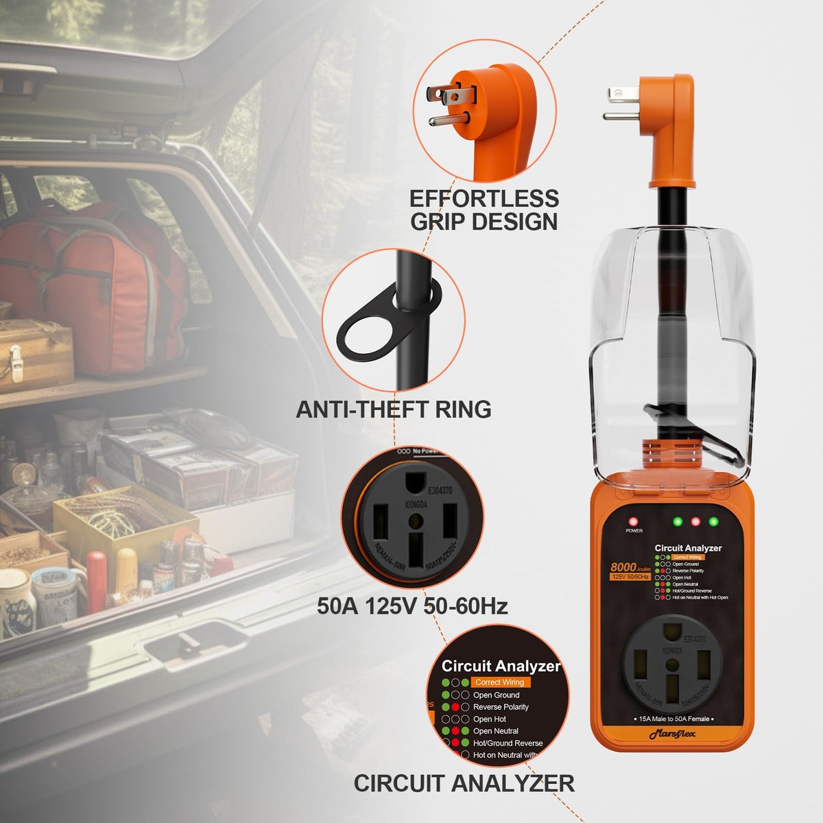 Marsflex Rv Surge Protector, 15 Amp To 50 Amp Rv Circuit Analyzer,8000 Joules Surge Protection With Waterproof Cover, 5-15P Male