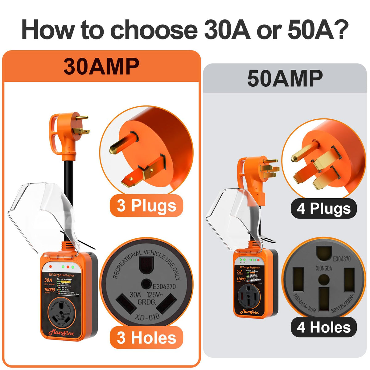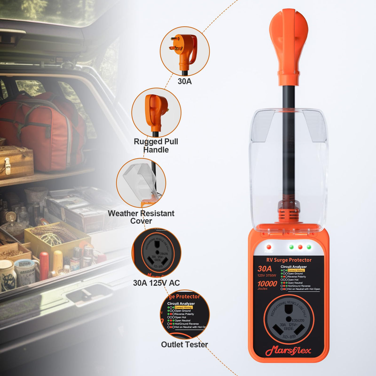 Marsflex Rv Surge Protector, 30 Amp Rv Circuit Analyzer, 10000 Joules Surge Protection With Waterproof Cover, Led Display, Rv Vo