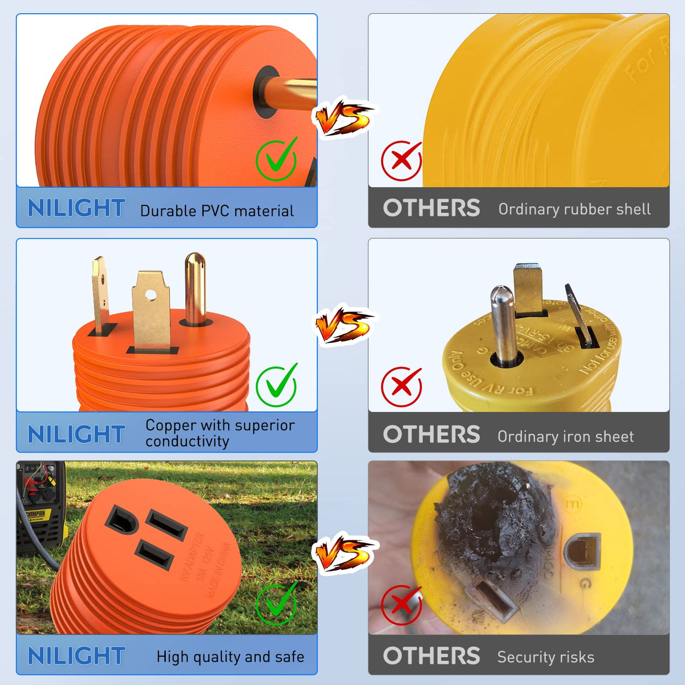 Q: Is the Nilight power adapter safe for use with my generator?A: Yes, the Nilight power adapter is rated for 110 Volts and is made of 100% pure copper, ensuring high conductivity and safe operation when used with electric generators or household power supplies.