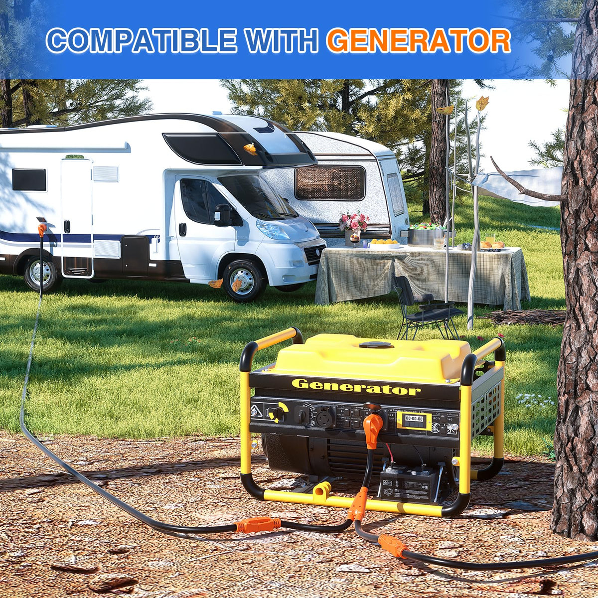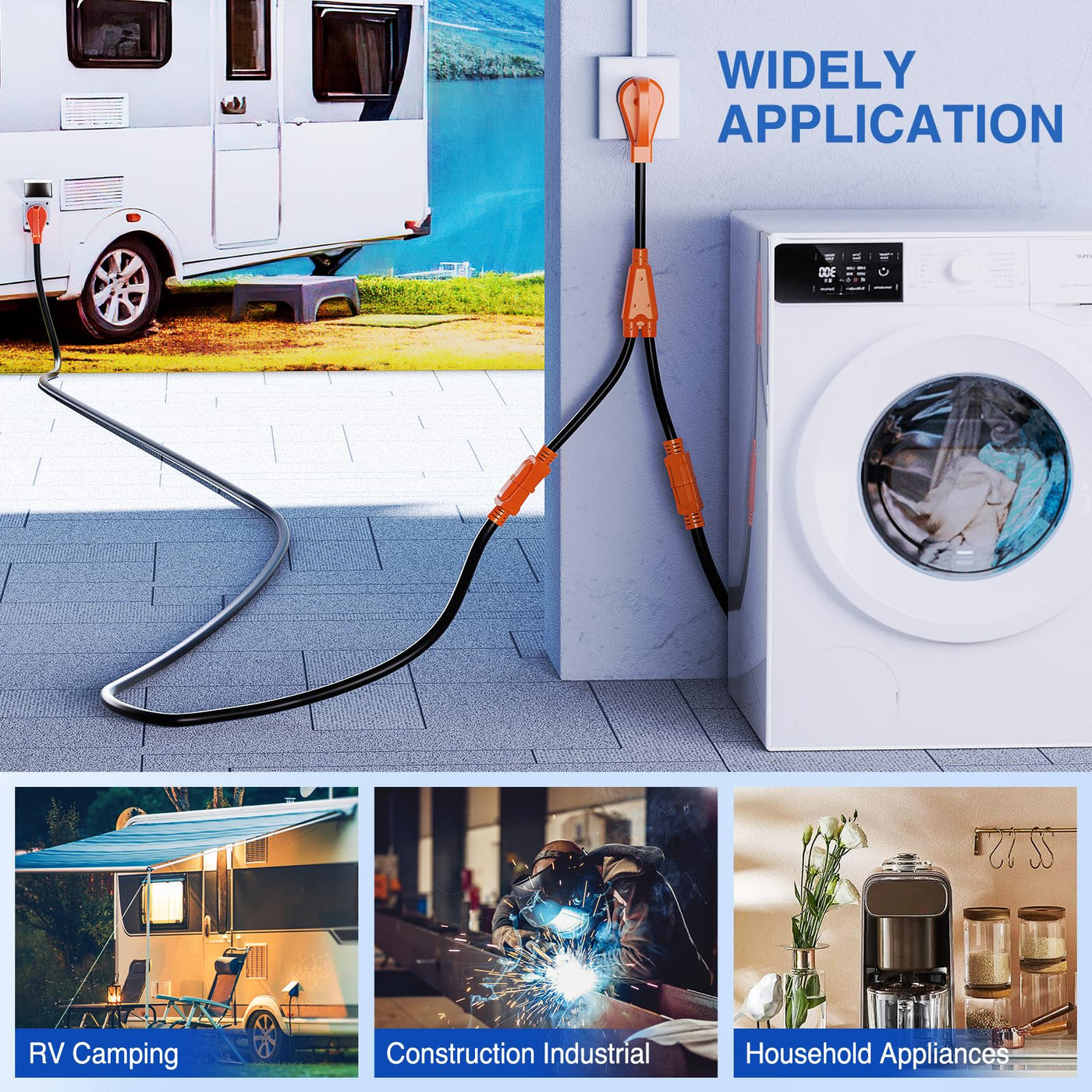 30 to (2) 15 Amp Adapter: Allows you to connect from a 30AMP external receptacle at RV Park or Campground to a 10 AMP service on your RV, which quickly supplies power for the refrigerator, air conditioner, microwave oven, roaster and other household appliances. This Y Splitter Adapter Power Cord provides an easy way to gain two 15A outlets from a NEMA TT-30P outlet. Allows to go directly from 30 to 15 amp outlets. A good choice have on the road, it gives you a option to hook two RVs into one power outlet. | Electrical Rating: 30 Amp (NEMA TT-30P) male to 15 Amp (NEMA 5-15R) female heavy duty power adapter. Rated for 125V and 3750W . Length 24 Inch. Constructed with 3 of 10 AWG wires to ensure the high electrical conductivity. | High Performance: Constructed with 100% pure copper with full 10 gauge wires ensuring high conductivity. The wires are stranded copper, it