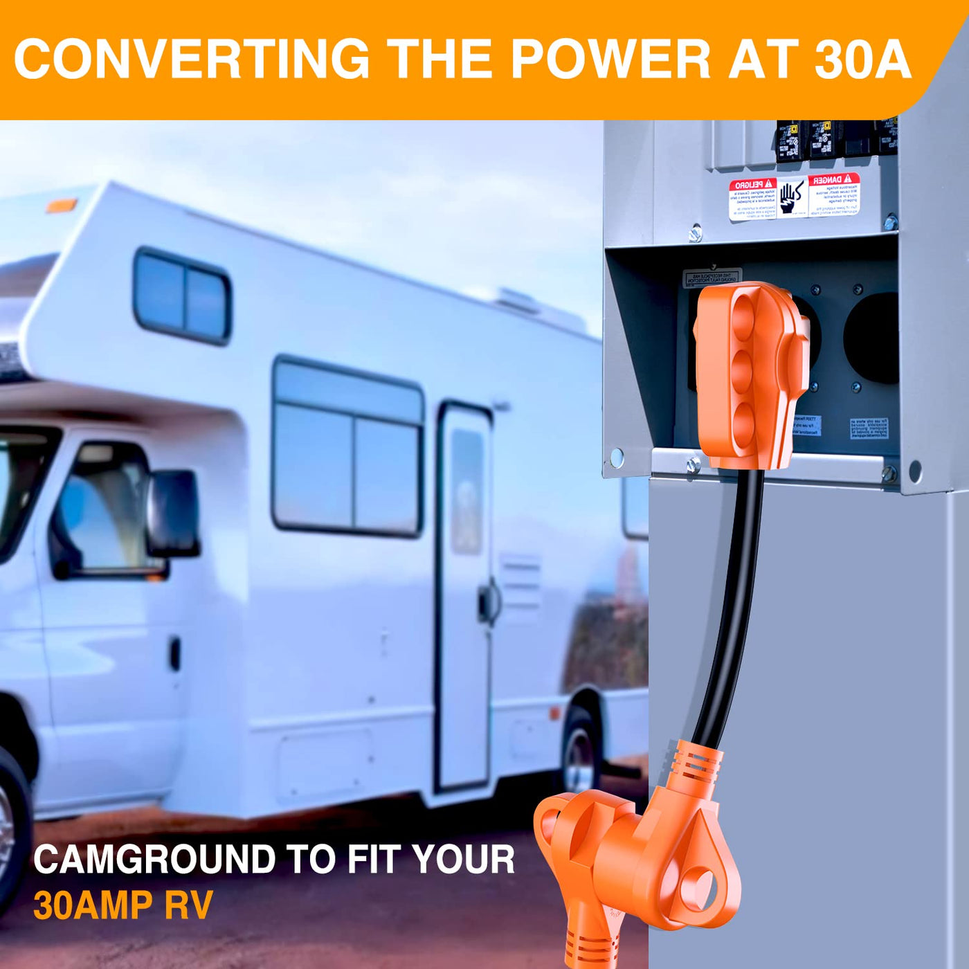 Q: Is this RV plug adapter compatible with all RVs?A: Yes, this adapter is designed to fit all RVs that operate on a 30 Amp service, making it a versatile choice for charging while traveling or camping.