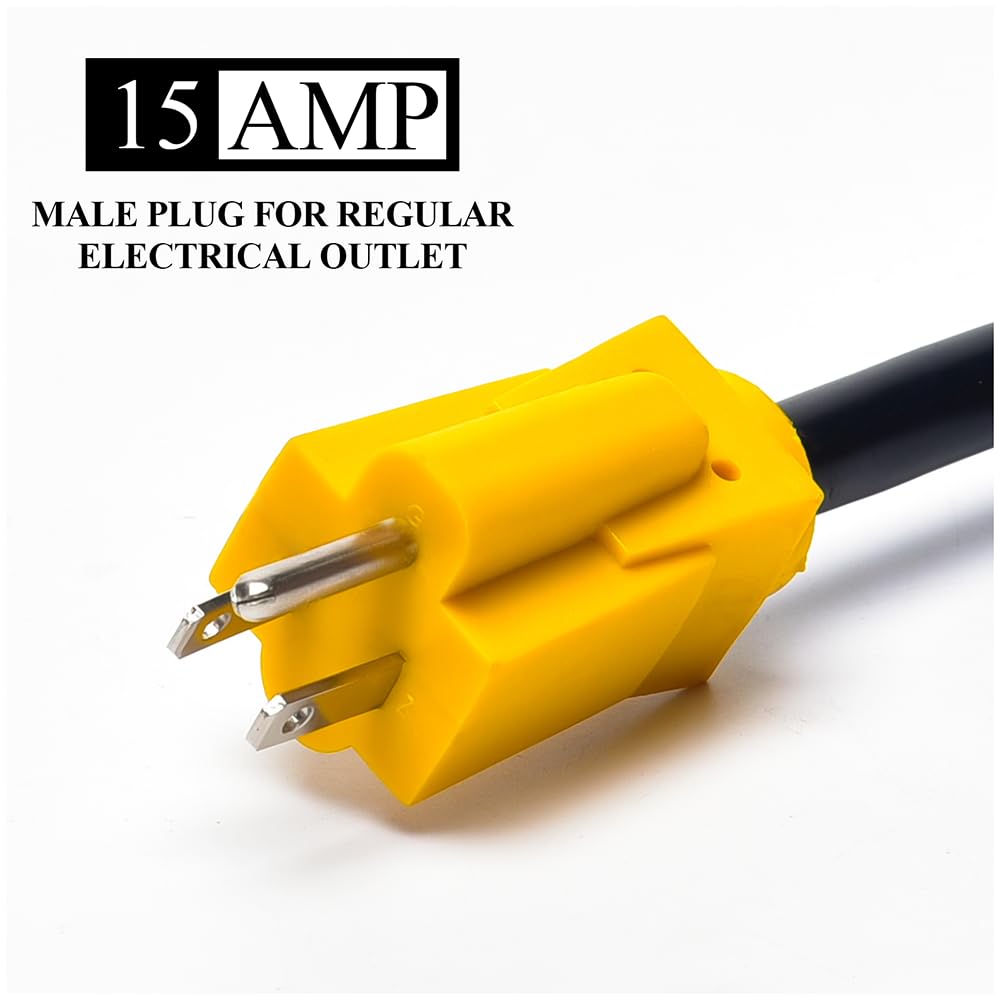 NEMA 5-15P to TT-30R | Rated value:15A/125V/1875W(Do not exceed the rated current and rated power.) | 12" length adapter,12/3 STW,made from high end 100% pure copper. | Handles are molded and made of heavy-duty polyvinyl plastic,and it makes plugging and unplugging easier. | Perfect for campervan,trailers,motorhome,caravan parks,campgrounds,recreational areas,etc.