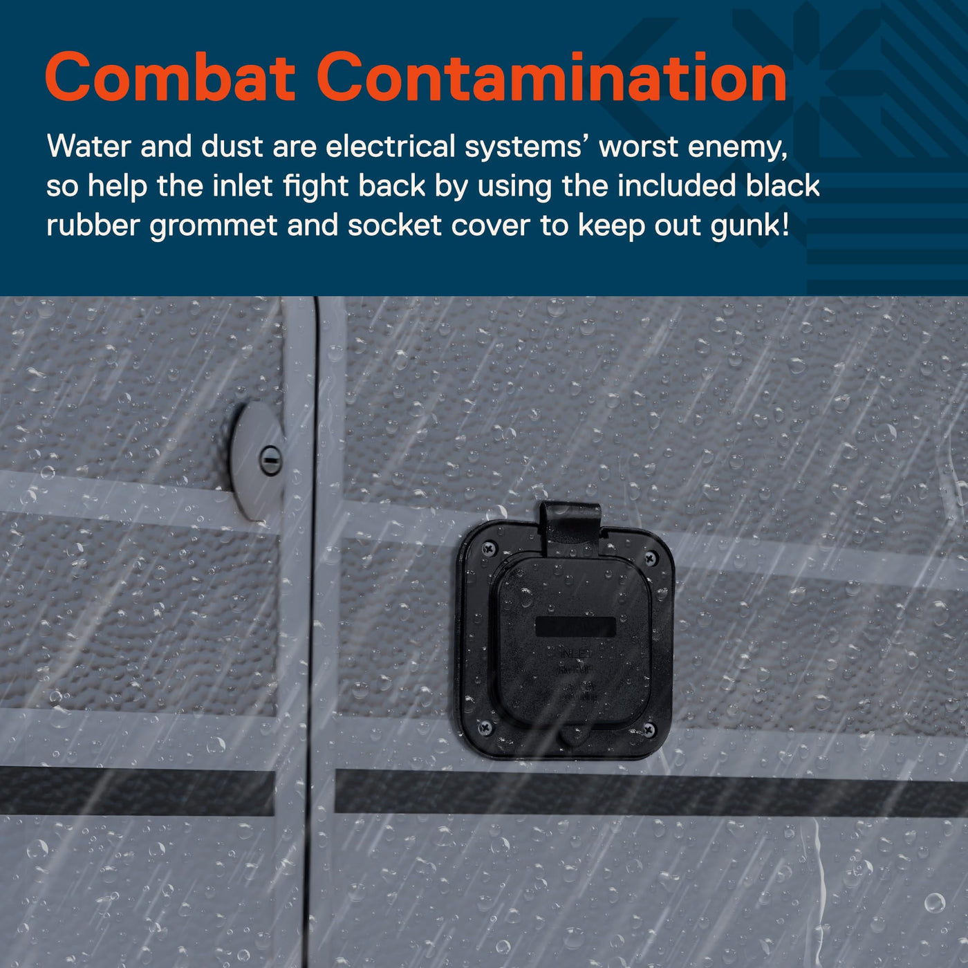 Q: Is the True Mods Flanged Inlet waterproof?A: Yes, the True Mods Flanged Inlet features a dustproof and waterproof design, with a black rubber grommet and socket cover that help keep contaminants out, ensuring safe and reliable power for your electrical systems.