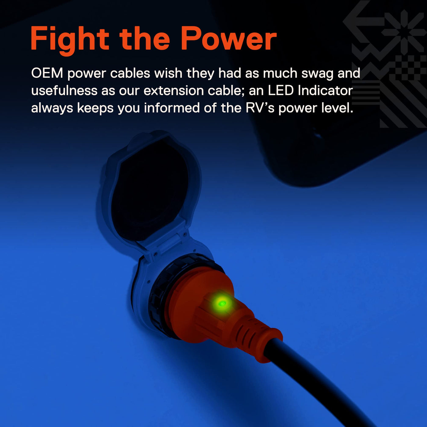 Q: What makes the LED indicator feature important on this extension cord?A: The LED indicator provides a visual cue of the power level, allowing you to monitor the electrical status of your RV appliances and avoid unexpected power issues.