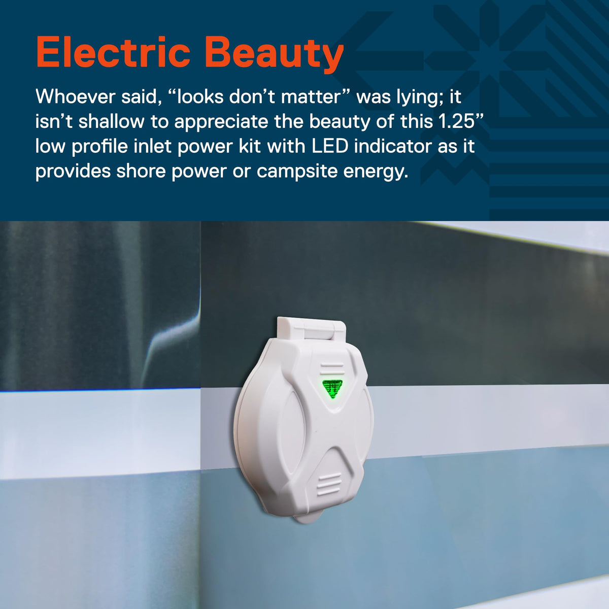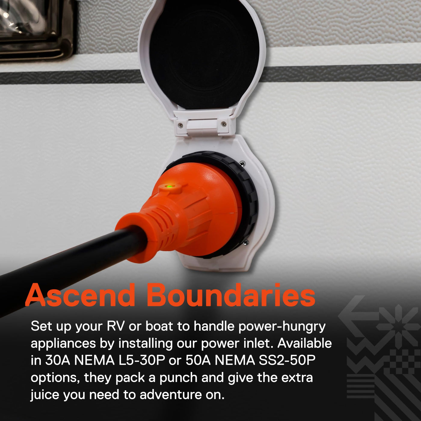 Jolt for 30/50A AppliancesRV owners, camper drivers & boat enthusiasts are making their next outdoor trip a drag without True Mods' 30 or 50 amp, 125V & 125/250V power inlet! 30 or 50 amps provide a boatload of power, so provide an energy jolt at the campsite or coast. This inlet offers ample energy for a microwave, a fridge, or even a large entertainment center with 50A! Yes, the teenagers can even charge phones as you enjoy brewing a steaming pot of Joe.Designed to DominateTrust that our engineers worked tirelessly to provide a power inlet with NEMA L5-30P or SS2-50P socket that will dominate for shore supply or camping juice. First, we ensured the inlet was UV Resistant to avoid long-term degradation and to keep the product in tip-top shape. An easy wiring construction also allows you to effortlessly and independently install the power wires. Lastly, a 1.25'' low profile helps the white inlet blend in and belong.Safe Addition to Electrical SystemWhen it comes to electricity, take caution with what you trust to power the family vacation. Outdoor fanatics can't do any better than our inlet's dust/waterproof design! The stylish cover lid keeps contaminants out of the system so you can relax and enjoy. A twist-lock design ensures a solid connection and an LED indicator informs of the connection. An ETL certification also backs this product and proves a smart purchase.Features30A 125V or 50A 250V power inlet10/3AWG or 6/3+8/1AWG CompatibleDust/waterproof designETL certified What's Included?Instruction ManualPack of screwsRV Inlet Socket
