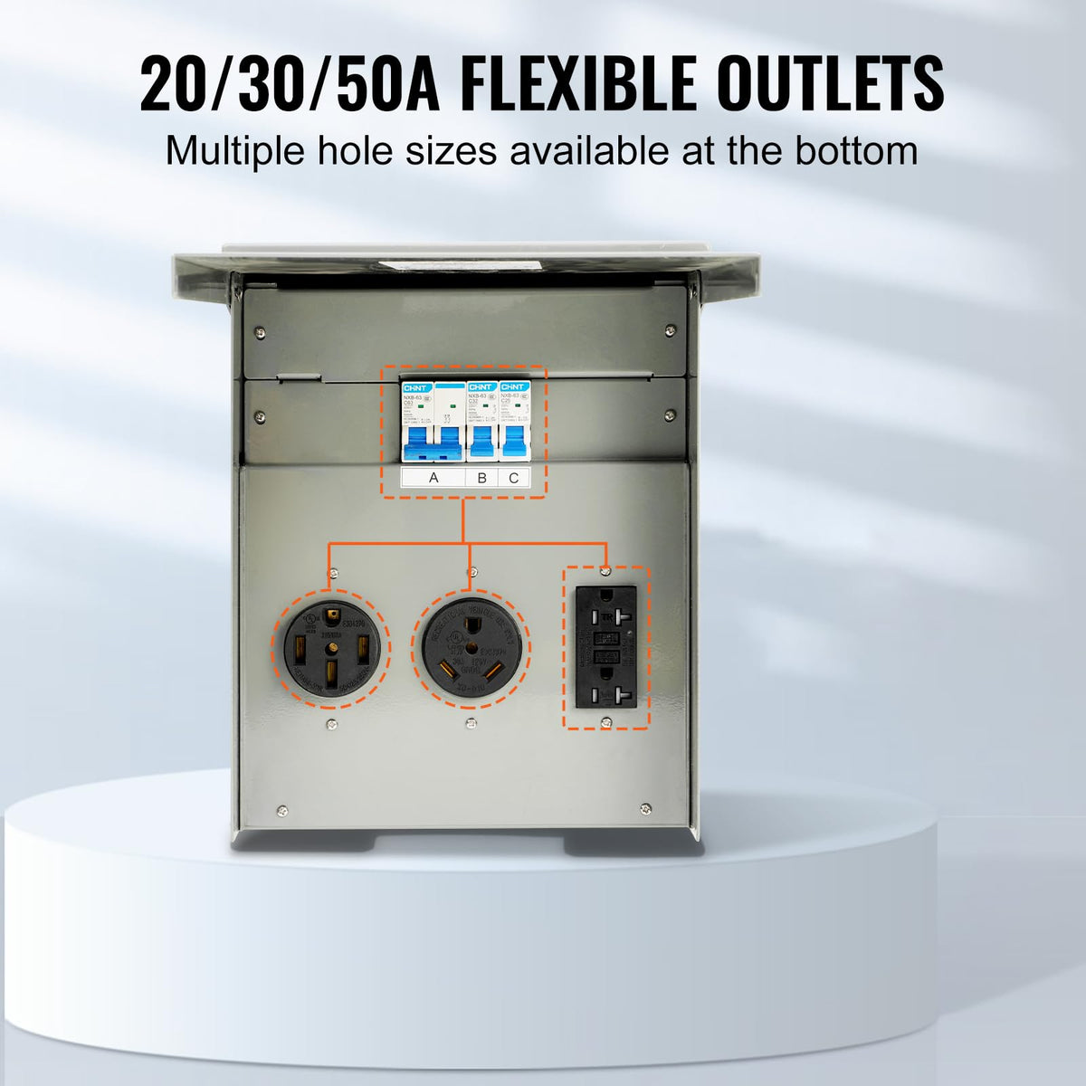 Vevor Temporary Power Outlet Panel, Weatherproof Rv Electrical Breaker Box With A 20/30/50 Amp Receptacle Installed, Prewired Circuit Nema 14-50R/Nema Tt-30R / 20A Gfci For Rv Camper Trailer Motorhome
