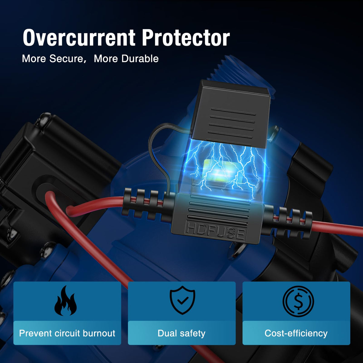 CrestWave 12V RV Water Pump, 7GPM 70PSI, 5-Chamber Diaphragm Pump with Overcurrent Protectors, Self-Priming Water Pressure Pump with Pressure Switch & Strainer for RV, Marine, Yacht, Caravan ? Double Protection for Circuit Systems Safety First Design: ? Dual Overcurrent Protectors Equipped with two overcurrent protectors to prevent short circuits and electrical damage. This added safety feature extends the pumps lifespan and protects your RVs electrical system. ? 5-Chamber Construction Design The upgraded 5-Chamber design provides outstanding reflux functionality, delivering smoother 7GPM flow at stable 70PSI pressure compared to 3-chamber pumps. Key Specifications: ? Pressure Control: Built-in 70PSI adjustable switch ? Protection: thermal, overpressure and dry-run protection ? Leakproof: IP68 waterproof rating ? Noise Level: =63dB ? Certifications: CE certified Wide Applications: ? Ideals for RVs, pumping, boats, campers, and irrigation. ? Works reliably in temperatures from 5-60C and operating environments of 5-40?