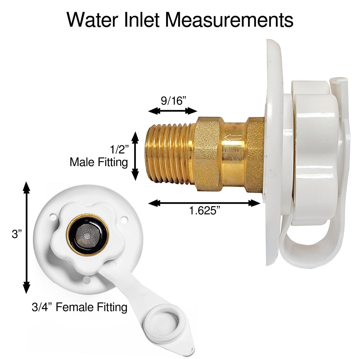 - A QUALITY BRASS CITY WATER INLET FLANGE DESIGNED FOR LONG-TERM OUTDOOR USE. Connect a hose to your RV easily and quickly. The flanges pipe and threading are made from brass for superior seal and durability over its plastic counterparts. - 1-YEAR WARRANTY AND U.S.-BASED PHONE AND EMAIL SUPPORT. Rest assured youre able to reach us for any tech support or other product related issues. We offer lifetime local phone and email support (available on packaging) and a 1-year warranty because we stand behind our product. As a bonus, youd be helping to support American jobs. - EASY TO INSTALL. Simply remove screws and unscrew any existing flange, thread plumbing tape on the new valve, screw it into fitting, and use the included 3 screws to fasten it.- PERFECT FIT AND SEAL. The flange is universal and should fit tightly without having to re-drill any holes. Plumbing tape with the brass thread make for a tight seal. The flange also contains a check valve to prevent backflow of water. Note: the angle of the flange must be threaded in correctly to avoid any issues. - DIMENSIONS. The flange is 3 in diameter, connects to a 1/2'' threaded pipe on the inside, and is 1-5/8 deep. It can be connected to standard size garden houses.