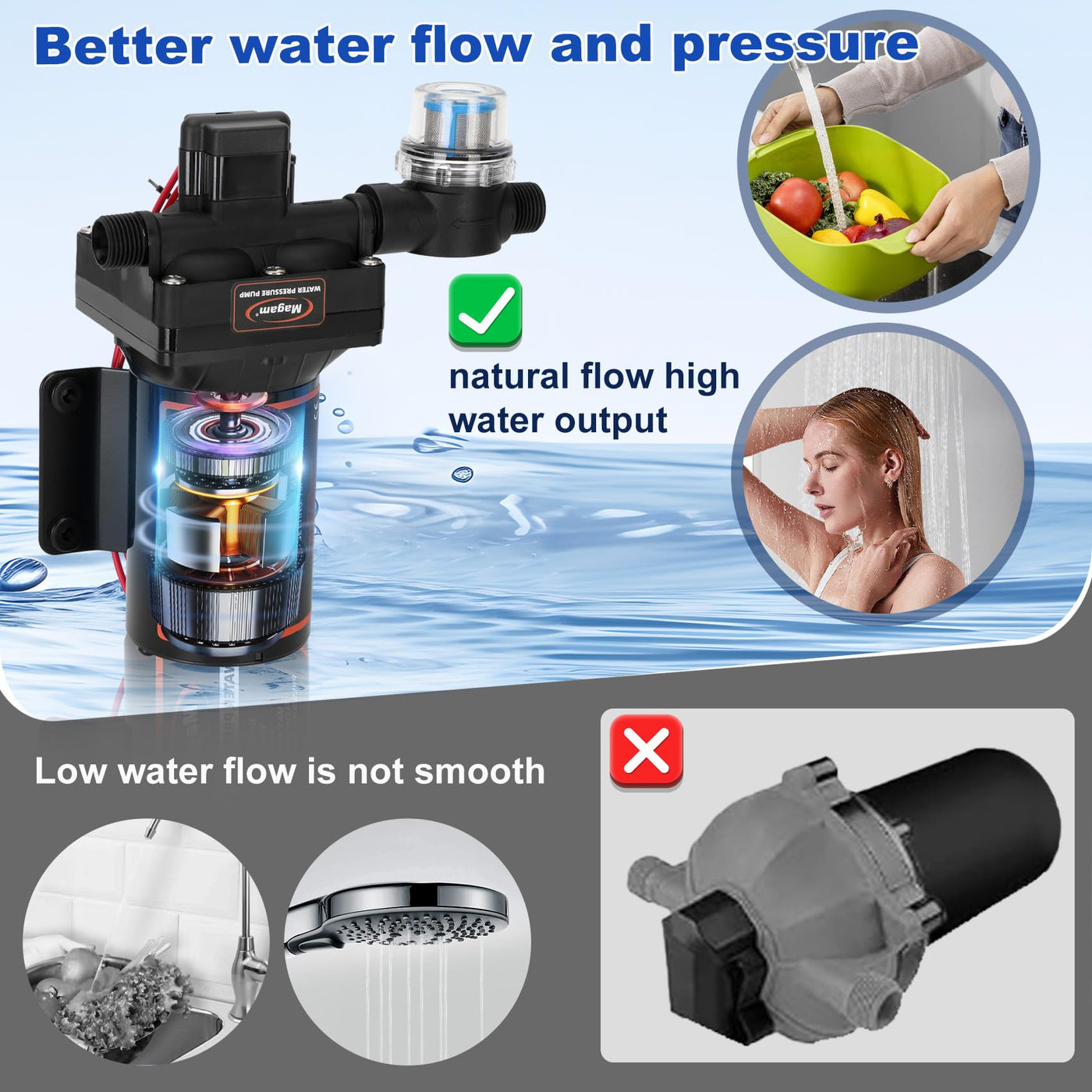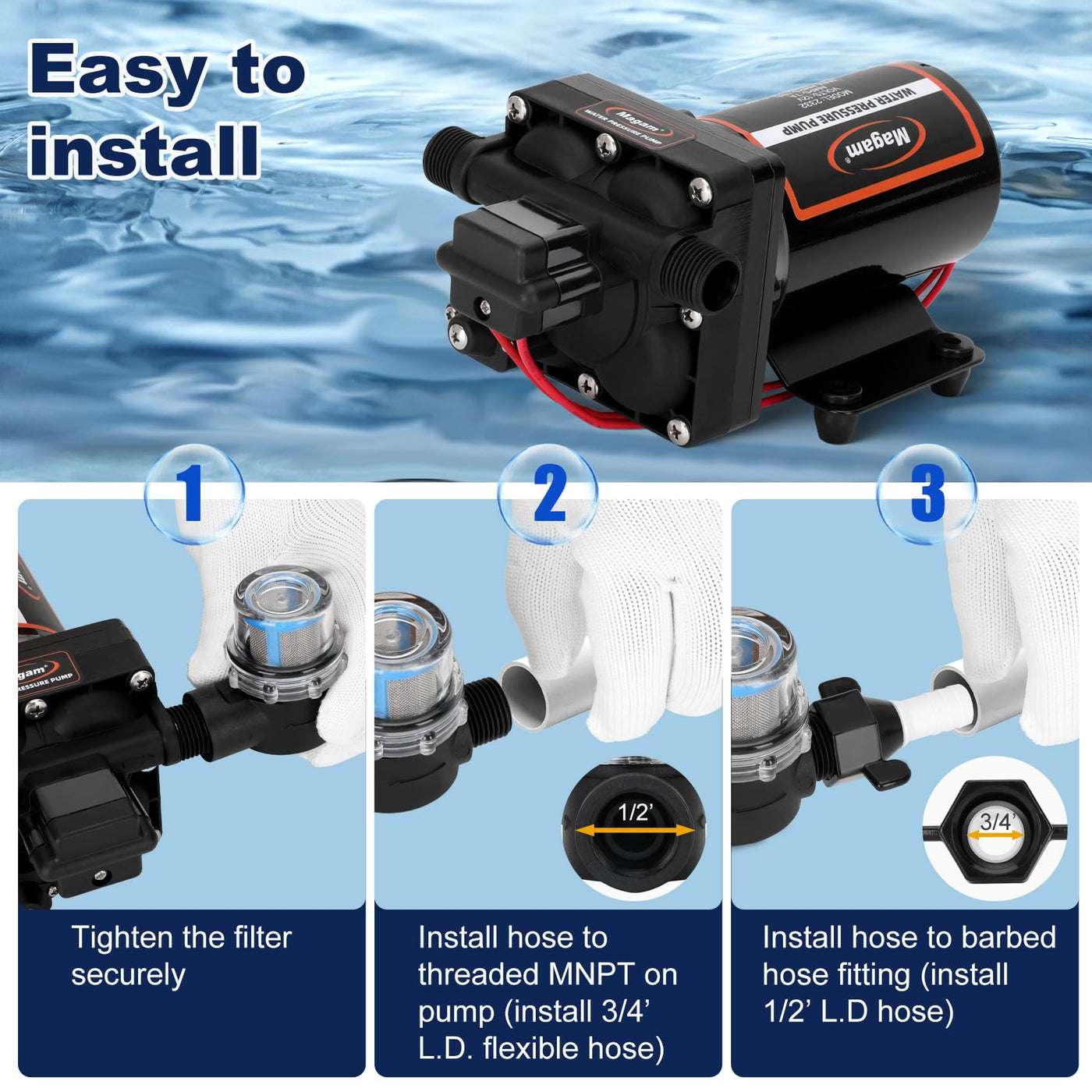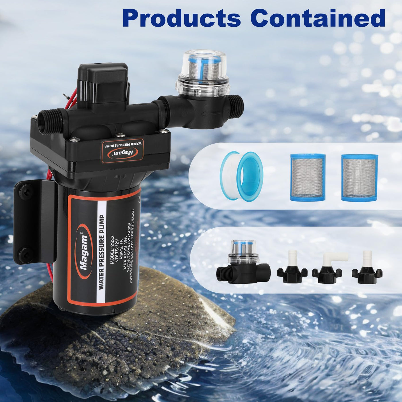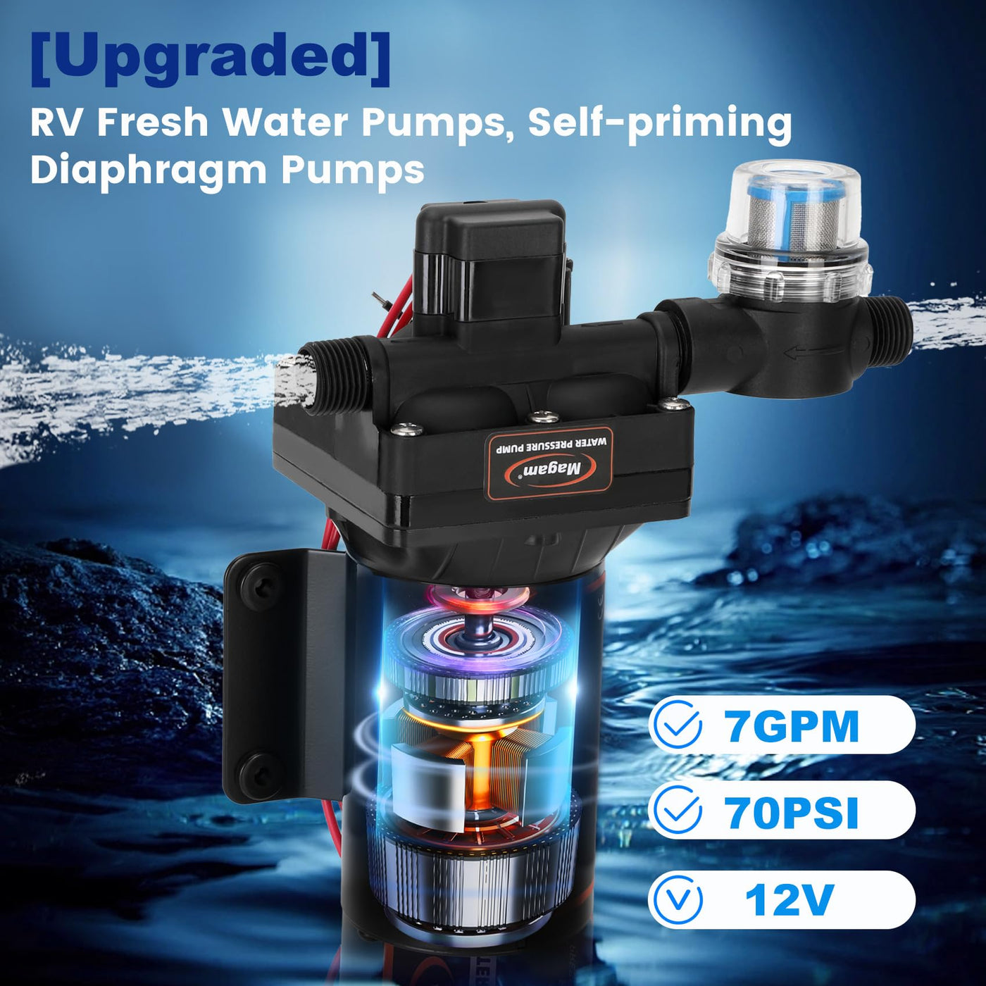 RV Fresh Water Pump, 12V DC Water Pump, 7 GPM 70 PSI Self-Priming Diaphragm Pump with Pressure Switch and Strainer, Suitable for