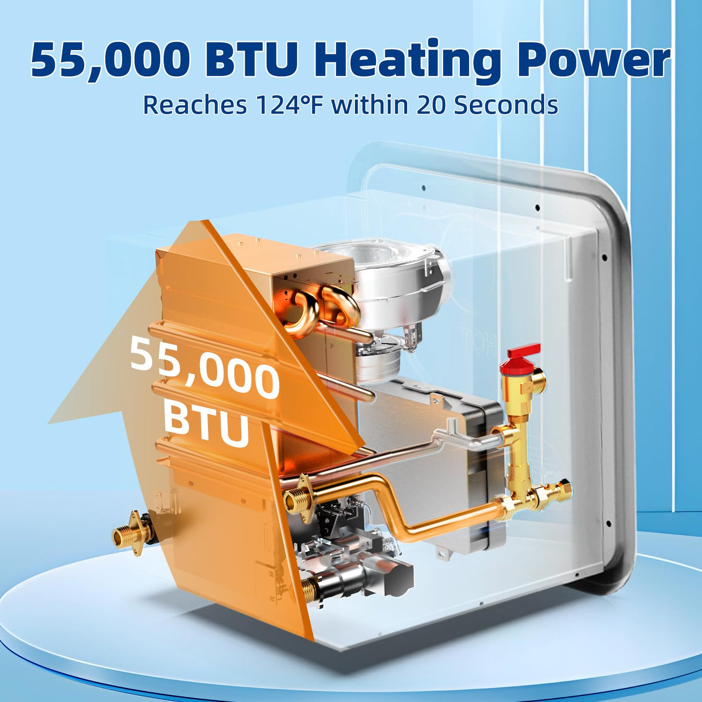 RV Tankless Water Heater, On Demand Instant Propane Gas RV Tankless Hot Water Heater with 16 x 16 inch Door & Front Water Outlet, 55000 BTUs 3.9 GPM, Compatible with All RVs, DC 12V, CSA Certificated