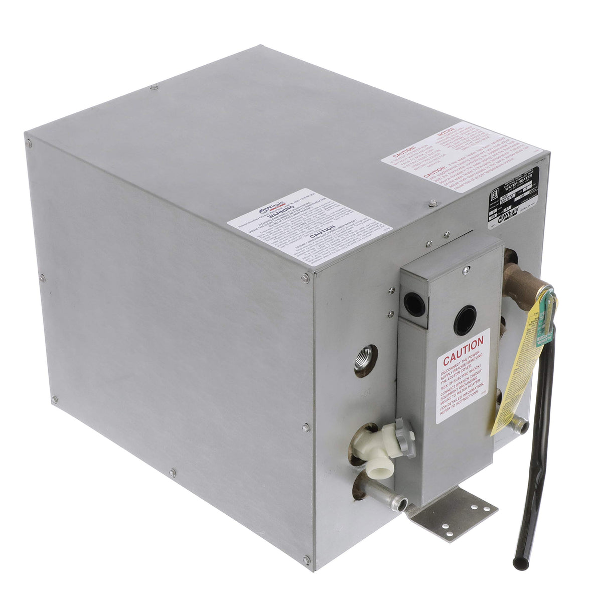 This Whale Water Heater reliably maintains a large supply of hot water, and its rugged construction ensures a long service life. This 120V Water Heater has a 6-gallon capacity, a double-walled front heat exchanger, a 100 psi rating, integrated pressure relief valve, and it comes with a temperature and pressure drain tube. It mounts horizontally and can withstand the rigors of marine environments long-term with its hold-down brackets welded to the inner tank, and its durable marine galvanized steel case. Meets or exceeds all ABYC, CE, and UL standards. This Water Heater measures 13 inches W x 19 inches D x 13 inches H. Whale designs and manufactures reliable marine water system products which are easy to install and use; providing boaters with hot and cold water, waste management and durable bilge pumps for peace of mind.
