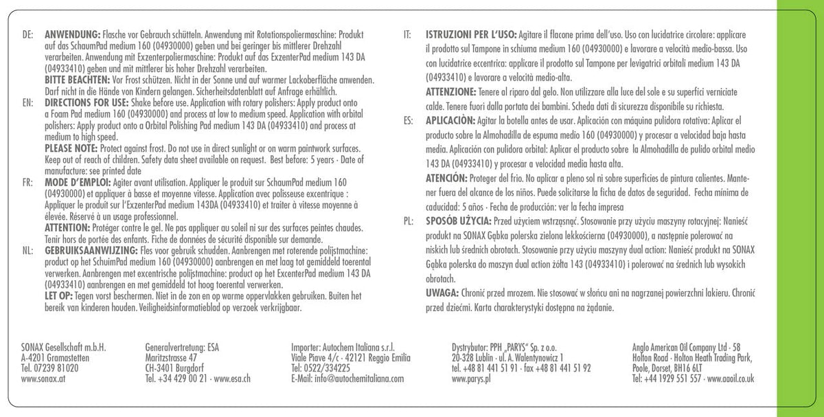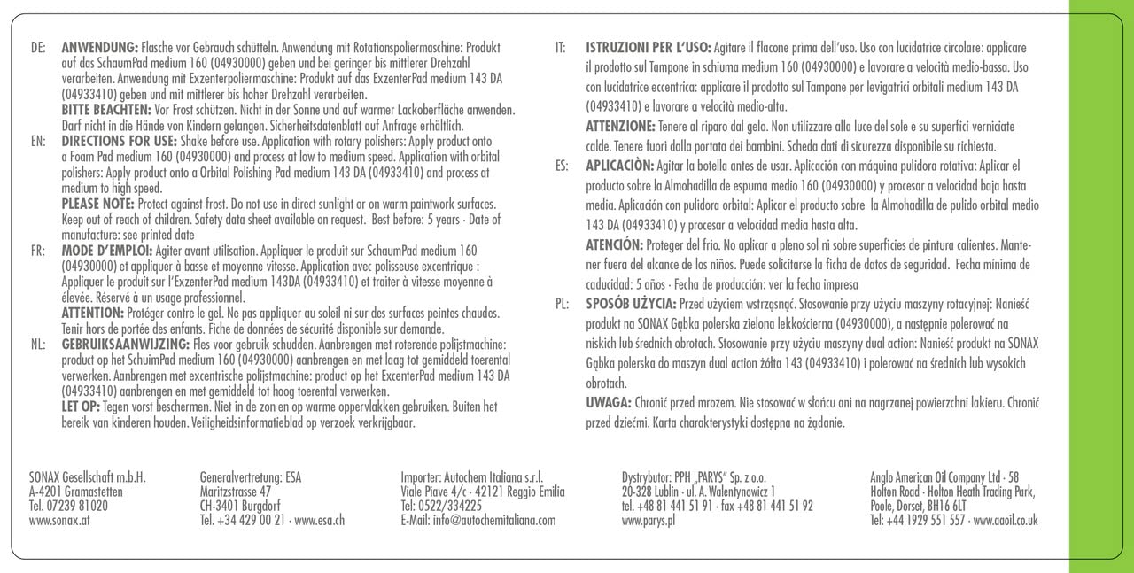 Q: How does SONAX Glaze OS 02-06 provide scratch removal?A: The product utilizes fine abrasives to efficiently eliminate P3000 scratches and wash-induced swirl marks. Its professional-grade formula delivers flawless, hologram-free finishes, making it highly effective for paint correction.