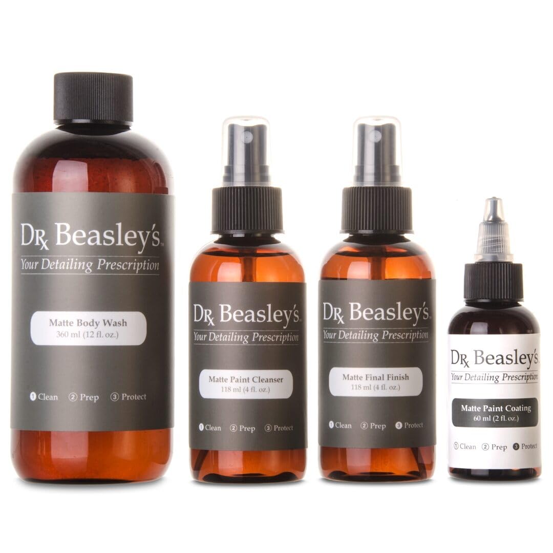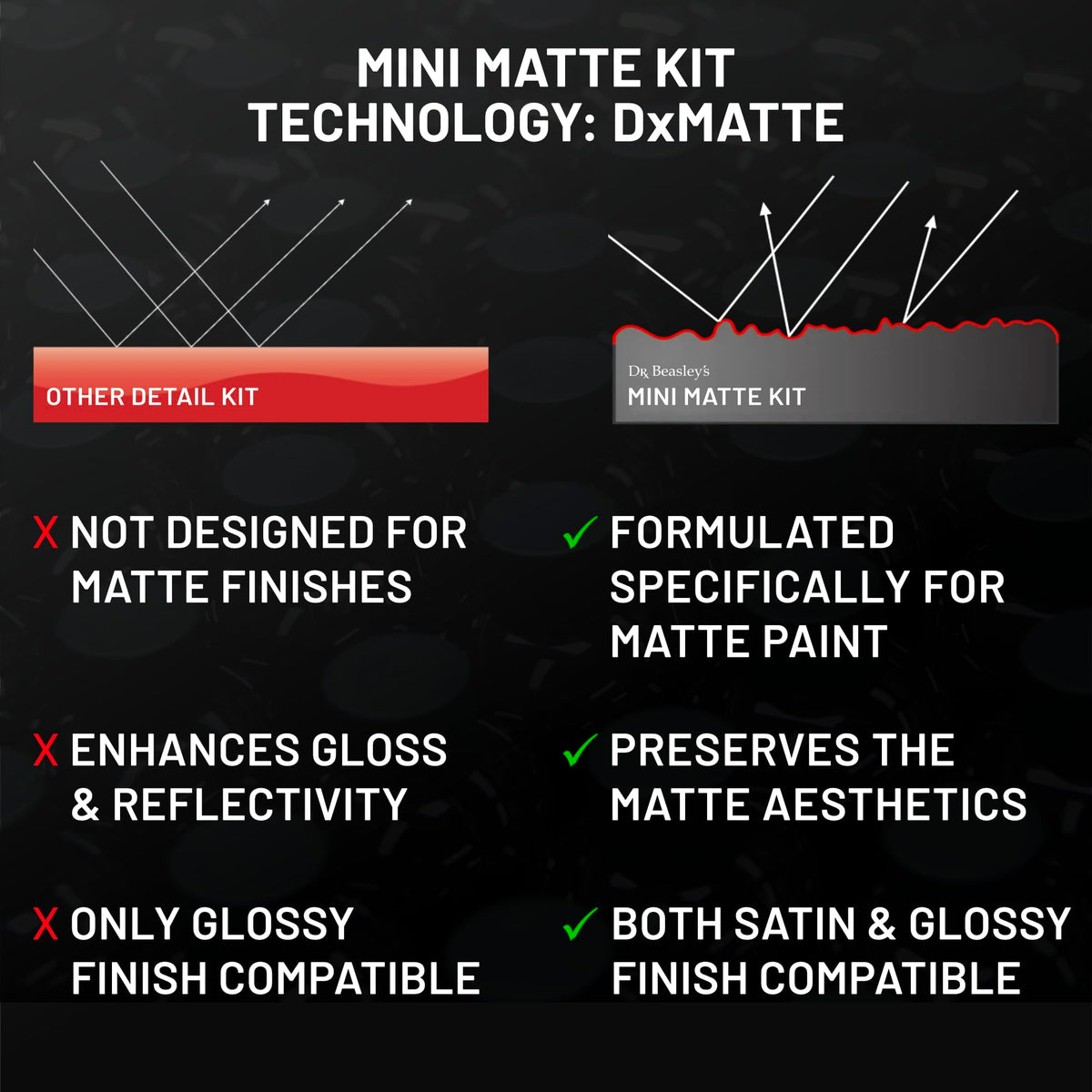 Q: What is included in the Dr. Beasley's Mini Matte Kit?A: The Dr. Beasley's Mini Matte Kit includes a selection of matte care products in smaller sizes, specifically designed for targeted areas of matte paint. The kit comes with 12 oz Matte Body Wash, 2 oz Matte Paint Coating, 4 oz Matte Paint Cleanser, 4 oz Matte Final Finish, along with essential accessories like Foam Applicators, Microfiber Towels, a Wash Bucket, Grit Guard, and Wash Pads.