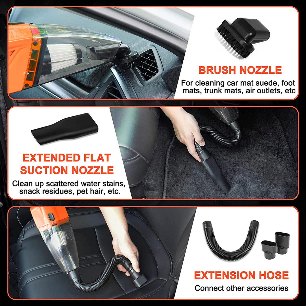 Q: How powerful is the handheld vacuum in this cleaning kit?A: The handheld vacuum in the HORDALOR cleaning kit features a 120W motor that provides nearly 7500Pa of ultra-strong suction, effectively picking up dirt, crumbs, and pet hair from your car's interior.