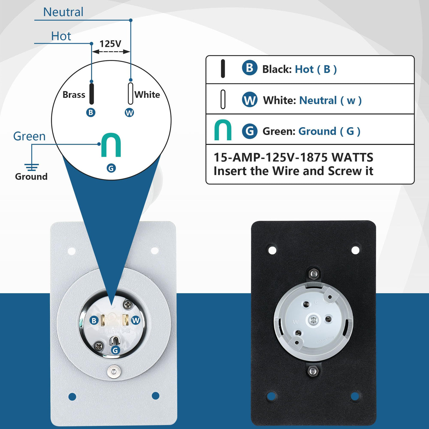 2 Pack 15 AMP Straight Blade Flanged Male Power Inlet Receptacle, 15 A, 125V NEMA 5-15P Integrated Nylon Faceplate Body and Rubb