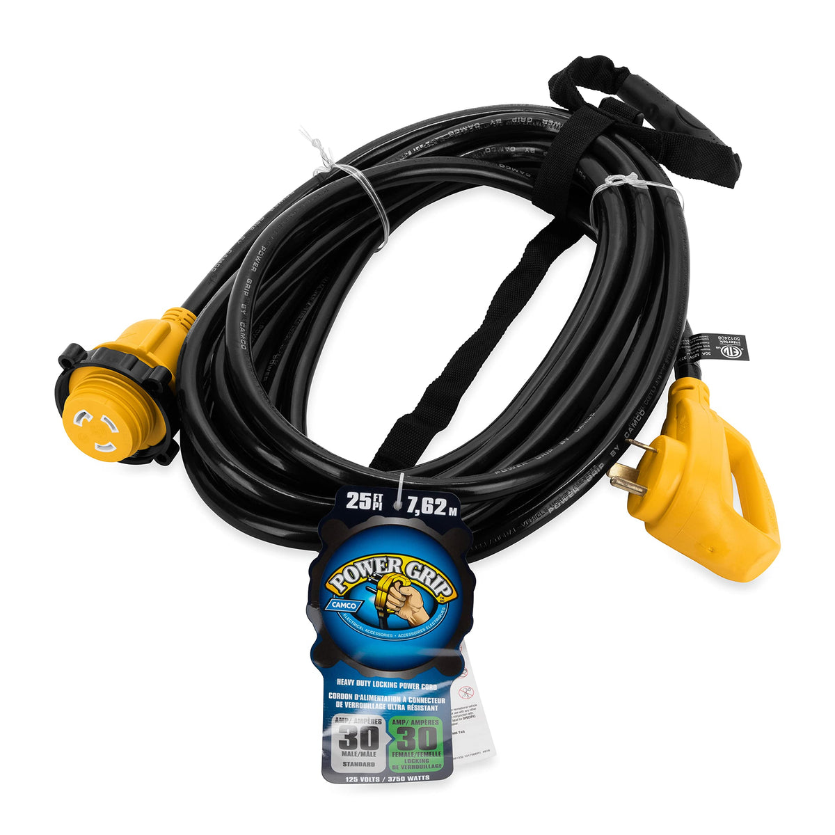 Camco Power Grip 25-Ft 30 Amp Rv Extension Cord W/Locking End - Rated For 125V / 3,750W - Features Threaded Locking Ring For Weatherproof Connection & Rv Power Cord 90° Head (55501)
