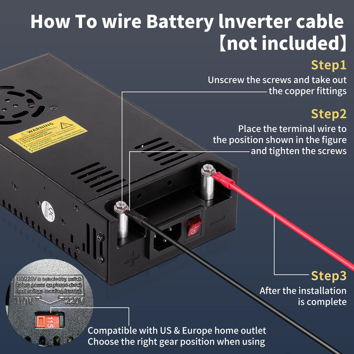 Q: How do I adjust the output voltage and current on this power supply?A: This power supply features an adjustable voltage and current function. You can set the output within the range of 12V and 1A to 50A based on your device's requirements. The input voltage adjusts automatically between AC 110V and 220V, ensuring compatibility with different power sources.
