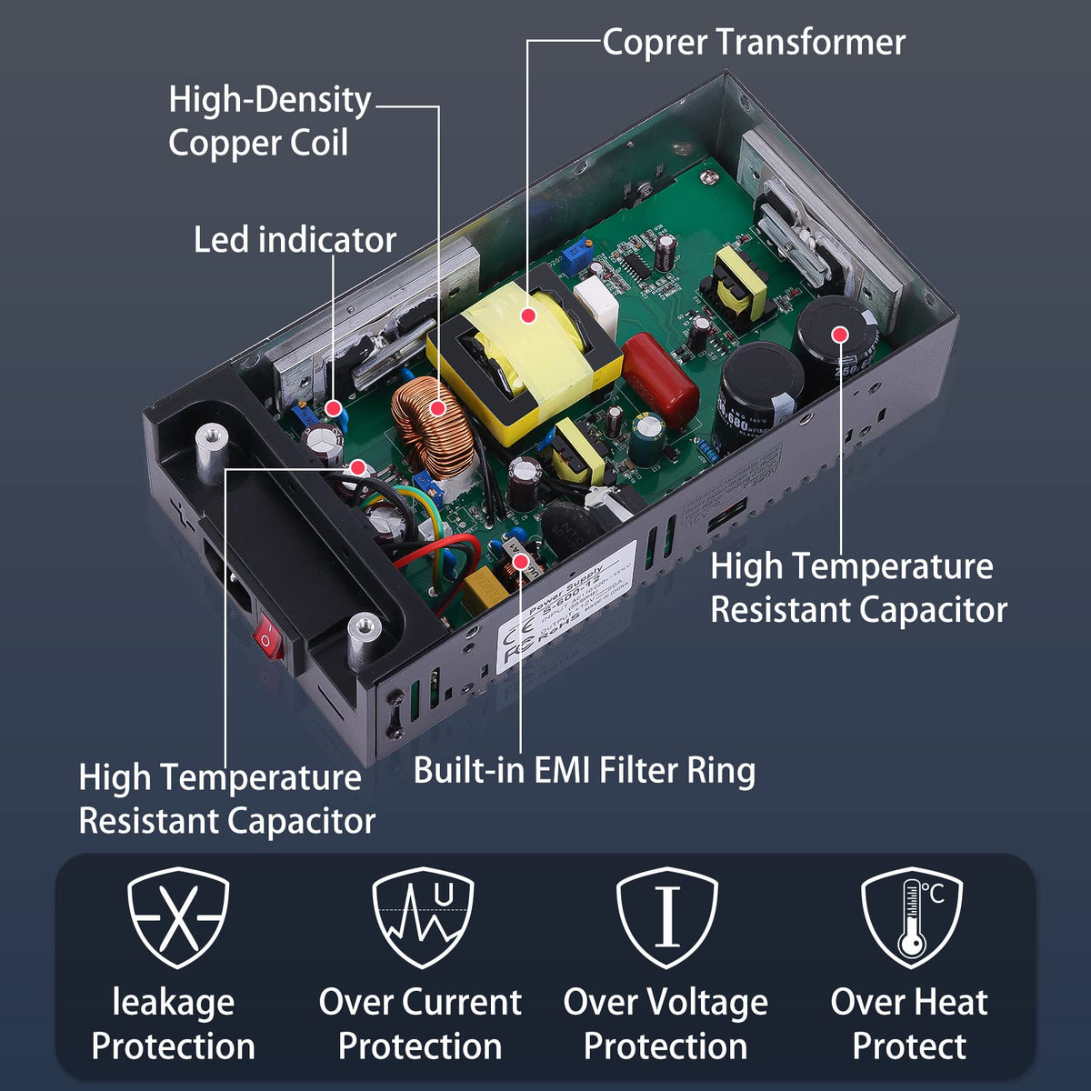 Q: Is this power supply safe to use with electronic devices?A: Yes, the power supply includes multiple safety features such as overload protection, overvoltage protection, leakage protection, and short circuit protection. It is certified by UL, CE, and RoHS, making it a safe choice for powering your electronic devices.