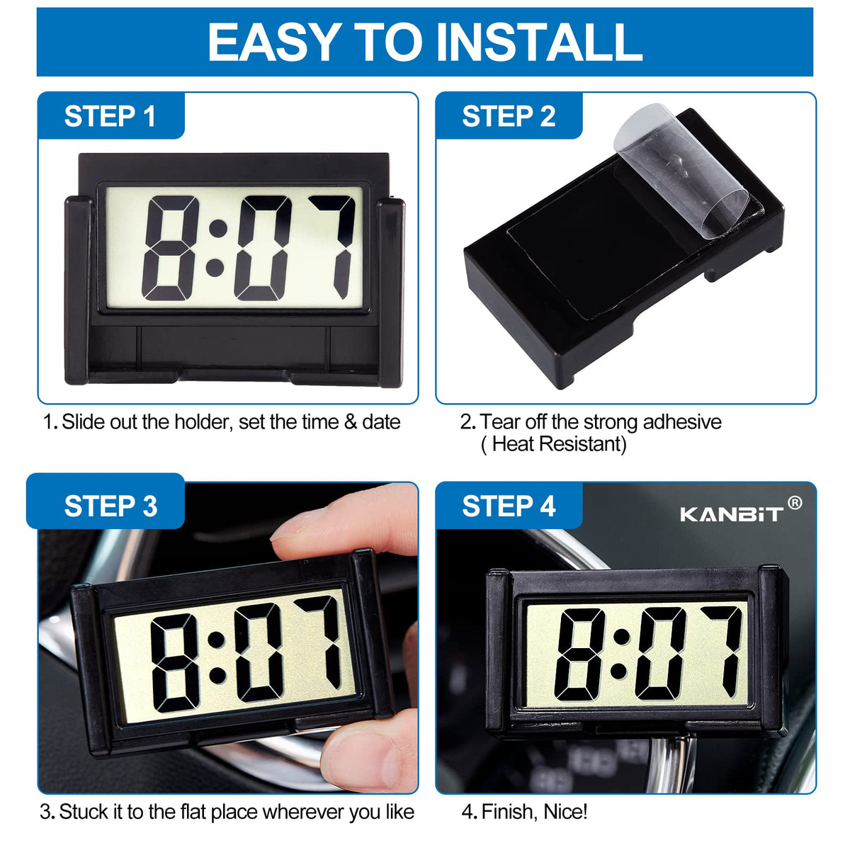 Q: Is the KANBIT car clock easy to install and set up?A: Yes, the KANBIT car clock is designed for easy installation. You simply slide out the holder, set the time and date, tear off the adhesive, and stick it to your desired flat surface. Additionally, it has a tiny kickstand for tabletop use.