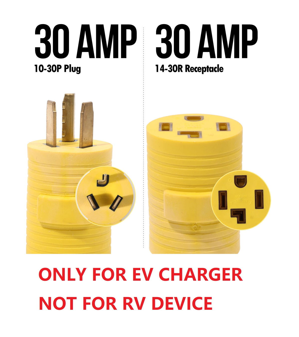 Product Description: The ONETAK adapter features a NEMA 10-30P plug to a NEMA 14-30R receptacle, providing a seamless connection for your EV charging needs. With an output of 240V and 30 Amps, this charger is tailored for quick and efficient charging, allowing you to get back on the road in no time. Please note, this adapter is specifically designed for electric vehicles and is NOT suitable for RVs.