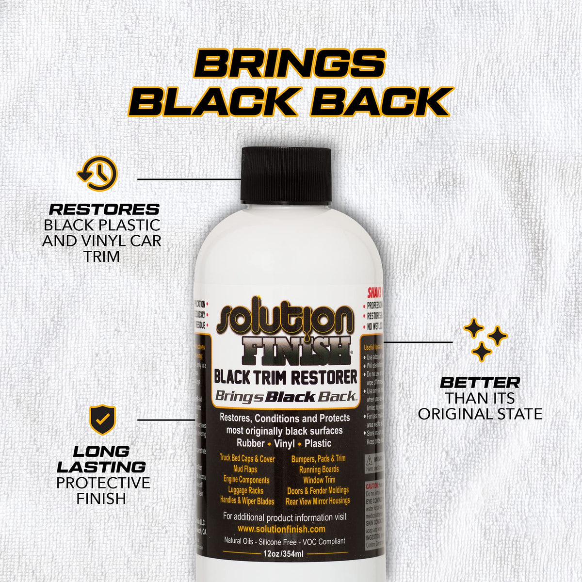 Solution Finish Trim Restorer restores black surfaces to a deep, rich finish, without any wet look or shine. This unique formula combines ancient ingredients with advanced polymer technology to provide a spectacular, long-lasting, black, protective finish. Use it to restore, condition, and protect bumpers, pads, trim, mirrors, mud flaps, window trim, seals, running boards, truck bed caps and covers, handles, wiper blades, etc. Another big plus with Solution Finish is that it is formulated for professional use, meaning it is a silicone-free solution that uses all natural oils and is VOC compliant.