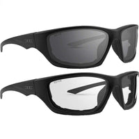 Weve elevated the look of one of our best riding sunglasses with a special nod to fashion-forward motorcycle riders, both the ladies and the gents, who want a little sparkle and shine on their ride. The Epoch 3 Foam Motorcycle Sunglasses come complete with a killer matte black frame, vented foam, and crystal and metal accents for the ladies. Ladies and gentlemen can also opt for a non-adorned set of frames for a more understated look. Keeping your eyes protected and your vision clear while riding that long and winding road on your motorcycle has never looked better. It's also never been so protective, comfortable, safe, or sold at such an amazing price. Not all at once, anyway. These aerodynamic, ergonomic, super-lightweight frames complete with comfortable air-ventilated foam ensure a snug and comfortable fit guaranteed to protect your eyes from the dust and airborne debris. Additionally, our shatterproof polycarbonate lenses will endure no matter what you put them through. These shades meet or exceed ANSI Z87.1 safety requirements and provide you with 100% UVA and UVB protection from the harmful rays of the sun. This set features 2 pairs of sunglasses with matte black frames, one pair comes with smoke lenses for the brightness of day and another with clear lenses to protect your eyes from wind, dust, dirt, and debris after dark.