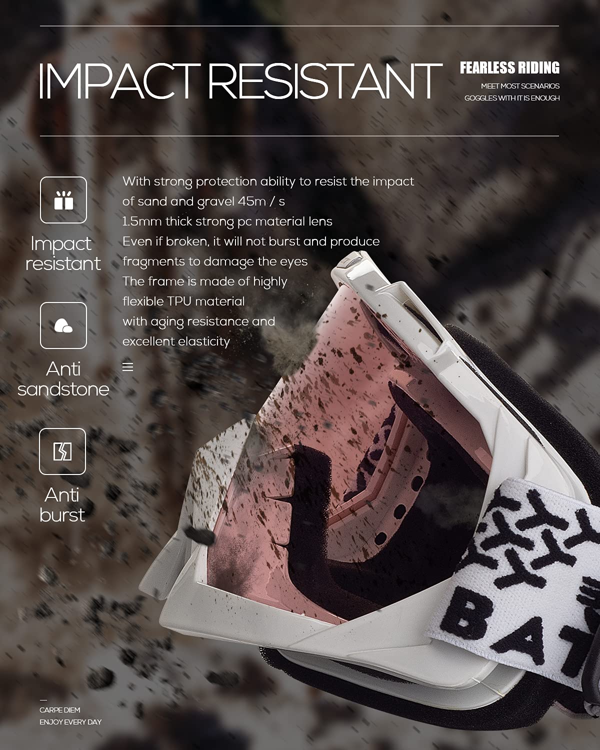 Q: Can I use these goggles for snowboarding or skiing?A: While some customers use the BATFOX goggles for snowboarding or skiing, it's important to note that their anti-fog performance may not match that of specialized snow goggles. If you primarily need goggles for winter sports, consider investing in professional options designed specifically for cold weather conditions.