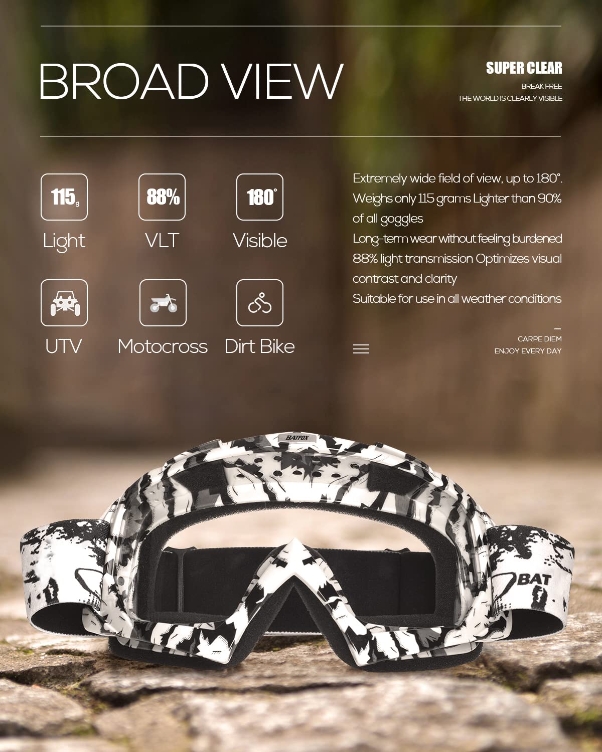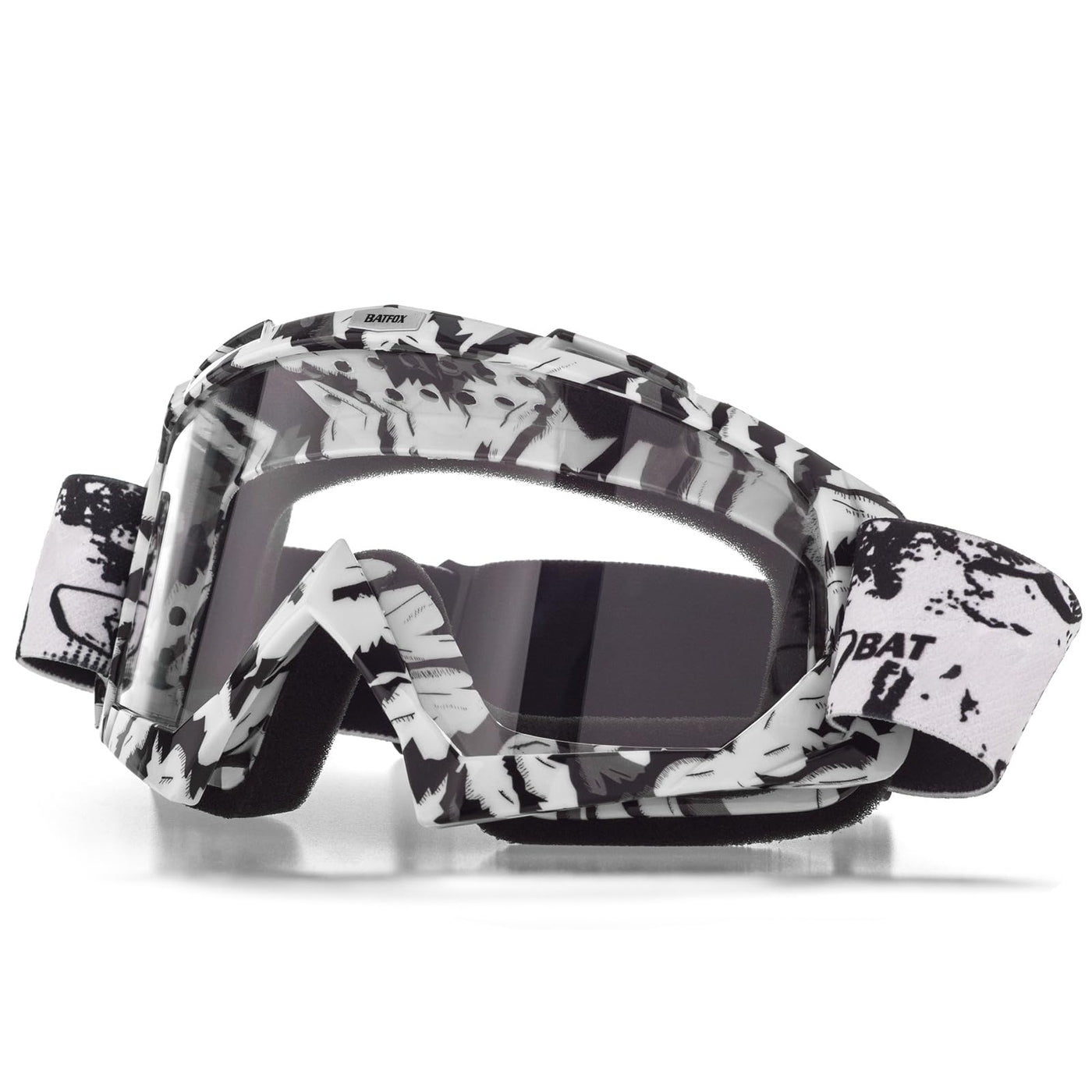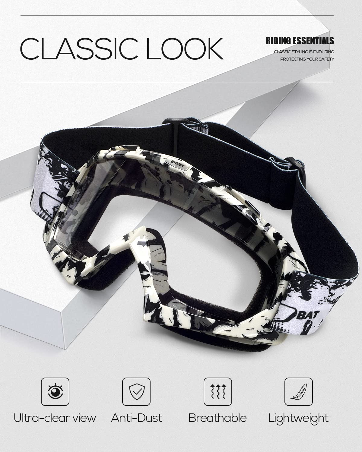 Batfox Dirt Bike Atv Goggles Motorcycle Glasses Goggles Riding Motocross 4-Wheeler Mx Dh Accessories Goggles For Men Women Youth Uv Protection Safety Dust-Proof Anti-Slip Strap(Clear-Black White)