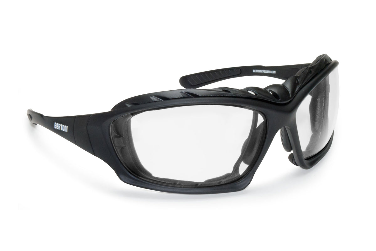 Bertoni Motorcycle Goggles Padded Sunglasses - Photochromic Antifog Lens - Removable Clip for Prescription - Interchangeable Arms Strap - mod. 366. Matt black frame in anticrash polycarbonate - Adjustable nosepad: soft adjustable nosepad offers an exceptional fit for any shape of face. This system also allows to adjust the glasses’ height and their distance from the face to prevent misting. Thanks to their excellent grip at arms, at the adjustable nose pads and thanks to the elastic strap, this sunglasses will stay in place. You can wear your tech sunglasses all day, don't need to change your lenses according to light conditions. Lenses are decentered in order to avoid any optical distorsion. Included a removable optical insert for prescription - any strength friendly, your optician can easily assemble your prescription to the clip - The inside of the front frame is covered with a removable windproof soft foam for a comfortable fitting. Interchangeables arms with elastic strap to have a very skin tight fitting for motorcycle and extreme sports - Size: suitable for all types of faces (narrow to large). 100% UV protection - Wraparound design: protects the eyes from wind and bad weather, provide enhanced peripheral vision - Lens width: 65mm ( curved sport wraparound windproof lens ) - Lens height 44mm - Optical Clip: 40x25 mm.