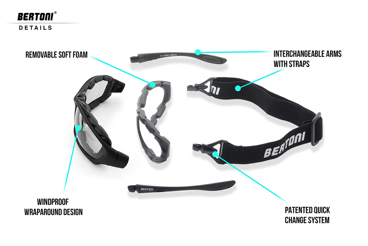Q: What are the main features of the Bertoni Italy Motorcycle Goggles?A: The Bertoni Italy Motorcycle Goggles feature a mat black anticrash polycarbonate frame, adjustable soft nosepads for a custom fit, photochromic and polarized yellow lenses that adapt to sunlight conditions, and removable optical inserts for prescription lenses. They are designed for comfort and durability, making them suitable for all face shapes.