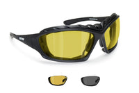 Frame: mat black anticrash polycarbonate - Adjustable nosepad: soft adjustable nosepad offers an exceptional fit for any shape of face. This system also allows to adjust the glasses’ height and their distance from the face to prevent misting - Thanks to their excellent grip at arms, at the adjustable nose pads and thanks to the elastic strap, this sunglasses will stay in place. Photochromic and Polarized Yellow LENS: photochromic to darken and lighten depending on the available sunlight and polarized to block blinding glare, from dark early morning starts to bright midday sun, to the long shadows of late afternoon cat. yellow 1 to smoke cat. 3 (this is the perception of the color of the lenses but thanks to the polarization the protection factor proceeds from cat 2 to 3). The yellow polarized lens is the one defined as the high definition lens par excellence, ideal for driving and sports activities that require an increase in contrast in conditions of low light, rain, fog, etc. Please note, photochromic lenses react to UV rays and will not darken when worn behind an helmet visor or windscreen that blocks UV light. They must be exposed to direct sunlight to initiate. Included a removable optical insert for prescription lenses - any strength friendly, your optician can easily assemble your prescription lenses to the clip - The inside of the front frame is covered with a removable windproof soft foam for a comfortable fitting. Interchangeables arms with elastic strap to have a very skin tight fitting for motorcycle and extreme sports - Size: suitable for all types of faces (narrow to large). Wraparound design: protects the eyes from wind and bad weather, provide enhanced peripheral vision - Lens width: 65mm (curved sport wraparound windproof lens) - Lens height 44mm - Optical Clip: 40x25 mm.
