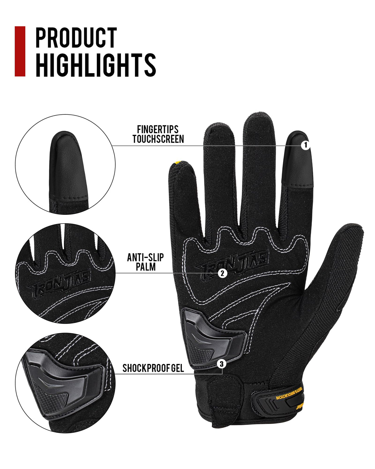1.Excellent Protection - The motorcycle riding gloves designed with knuckle protection and palm pad,reinforced palm and double stitching for external protection shell,avoid fingers and knuckles from getting injured and bruised,offers a great protection for your hand. | 2.Touchscreen Compatible - The Motorbike gloves add friendly touching function to index fingers part of the glove,so you can easily operate your phone and don't need to take off gloves. | 3.Comfortable Control - The full finger motorcycle gloves are made of durable microfiber material,they are wear-resistant,anti-slip,increasing grip of your handlebars,you can control the throttle and speed more easily,operate your motorbike more safely. | 4.Keep Cool - The motorcycle gloves are made of breathable material,with air vents for better air flow, protect you and keep your hands cool in hot weather,no more sweaty hands,suitable for using at all seasons. | 5.Occasions - The motorbike gloves are suitable for bicycle riding,motorcycle racing,Hunting,Climbing,fishing,hiking,motocross,skiing,scooter etc.